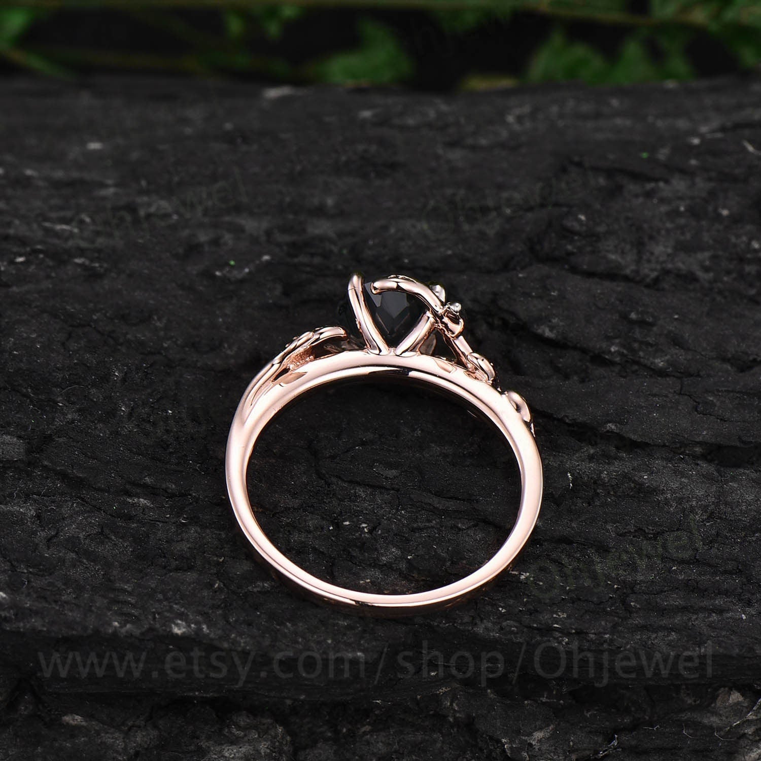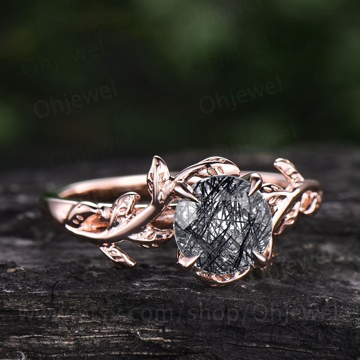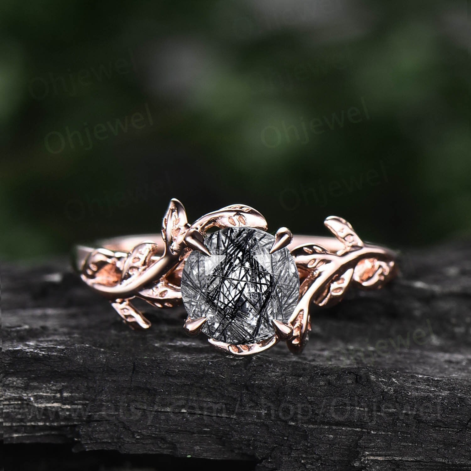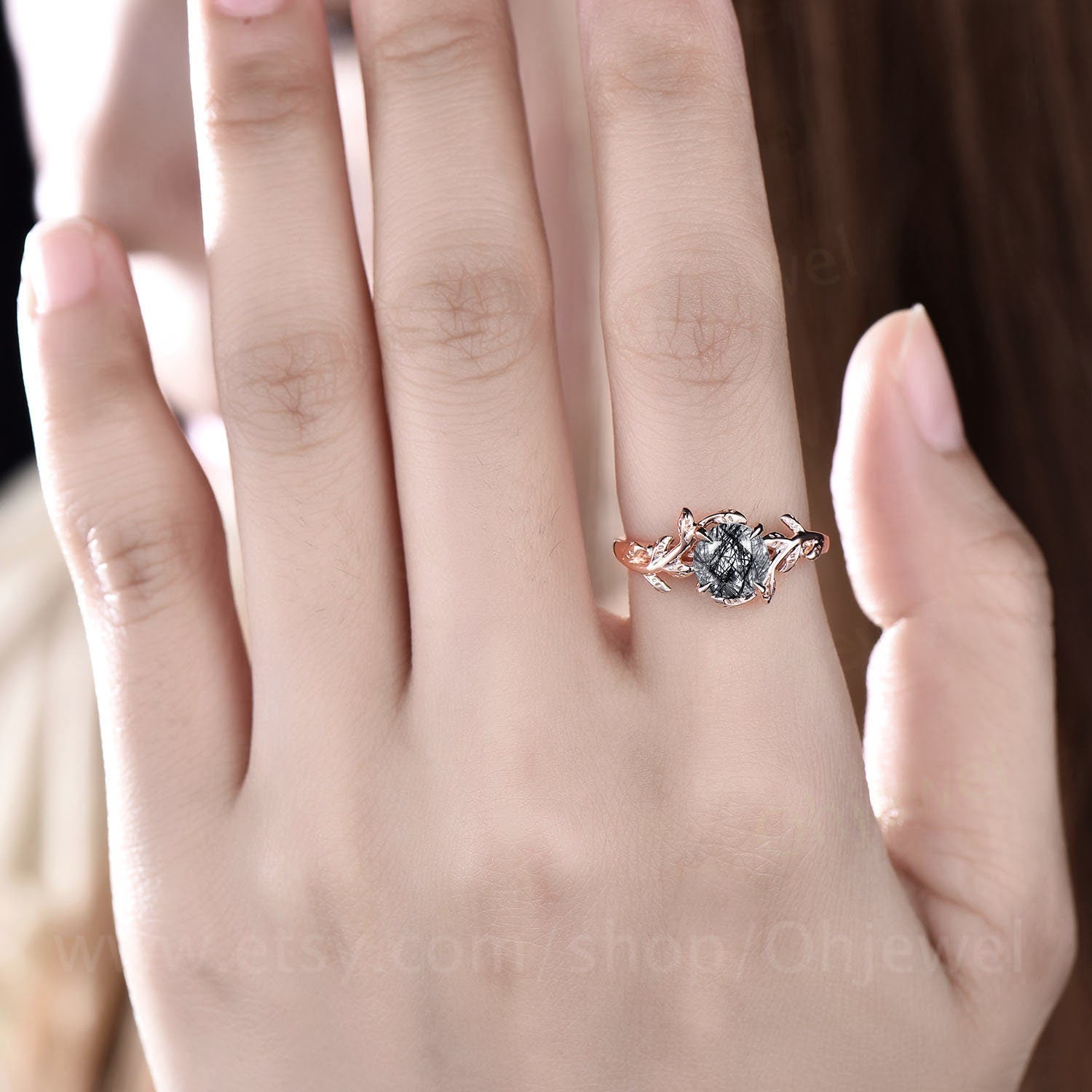 Vintage black rutilated quartz engagement ring leaf flower art deco rose gold silver round cut solitaire ring for women anniversary gifts