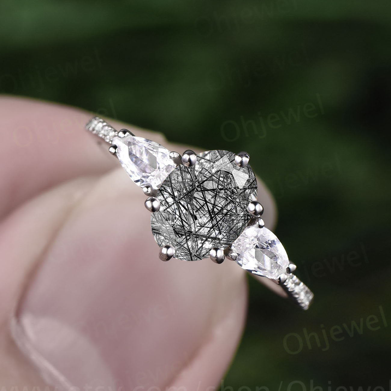 Vintage black rutilated quartz engagement ring pear shaped moissanite ring white gold eternity diamond ring for women black stone ring gift