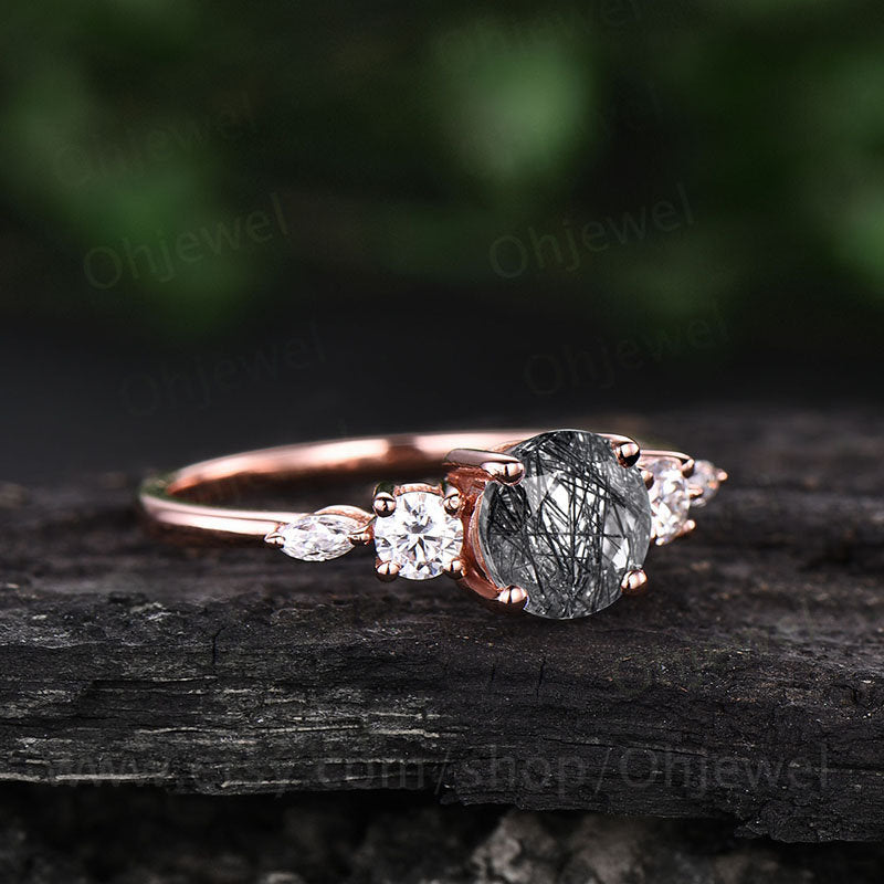 Vintage black rutilated quartz engagement ring rose gold art deco moissanite ring gold silver round cut ring promise wedding bridal ring