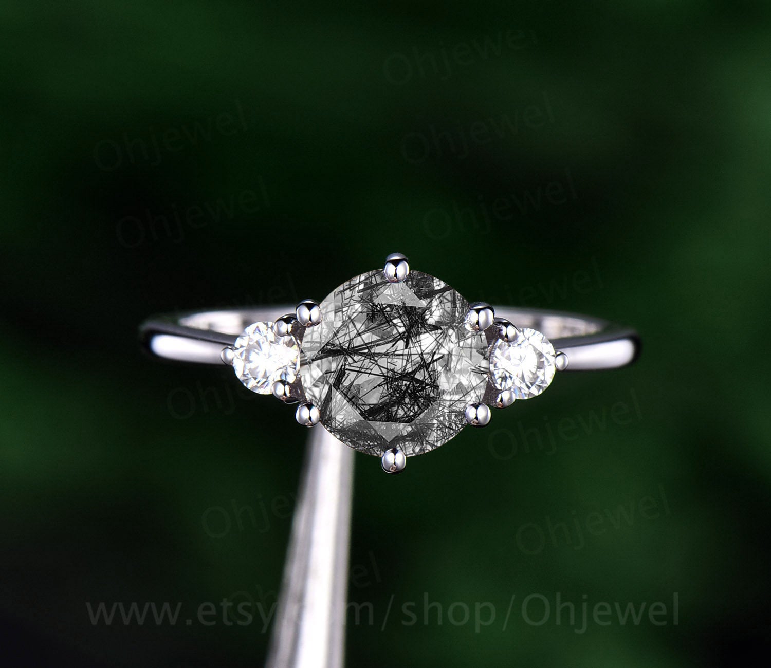 This is a Black Rutilated Quartz engagement ring in solid gold,about 7mm round cut. The accent stones are round 3mm moissanites.