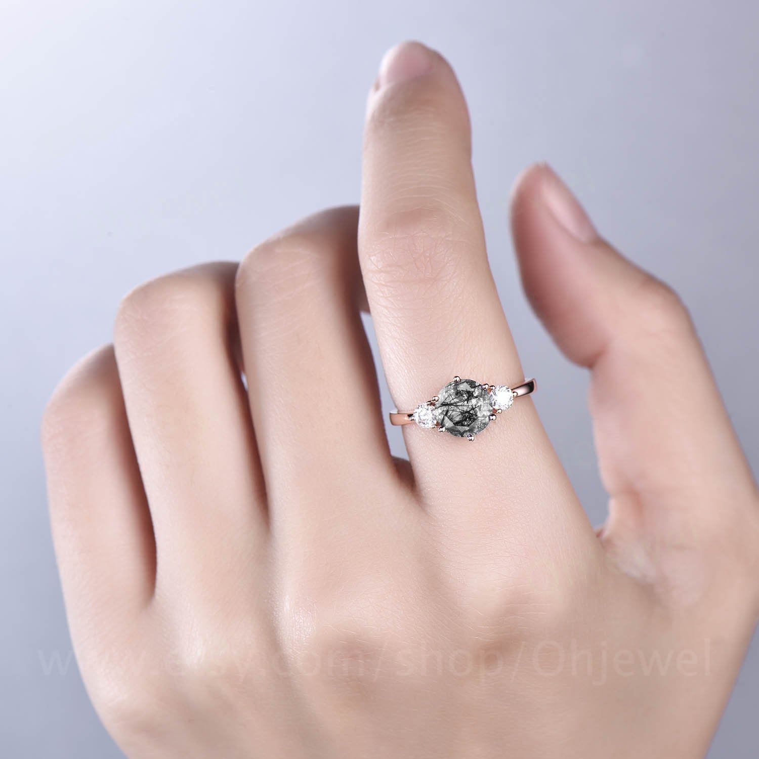 Vintage black rutilated quartz engagement ring rose gold for women three stone ring unique moissanite ring wedding bridal anniversary gift