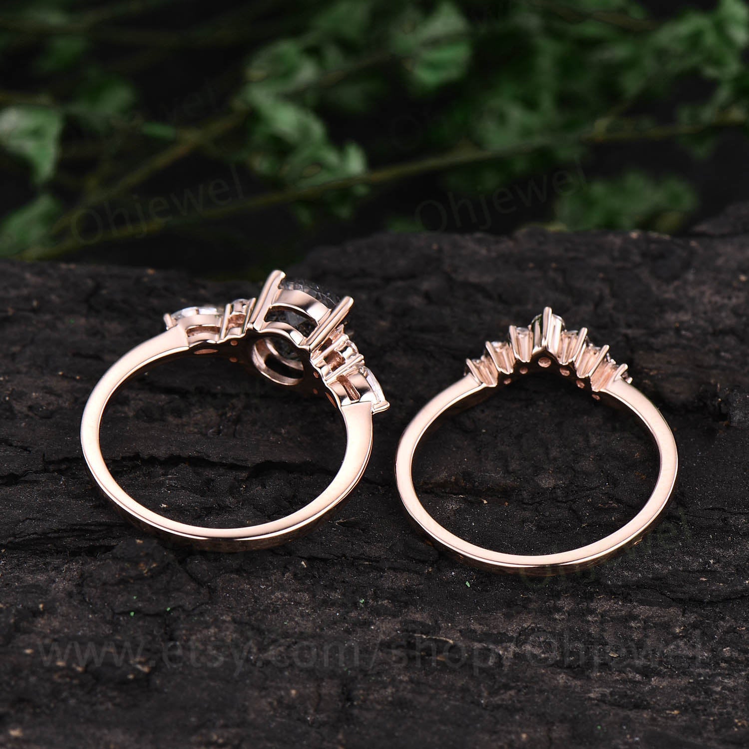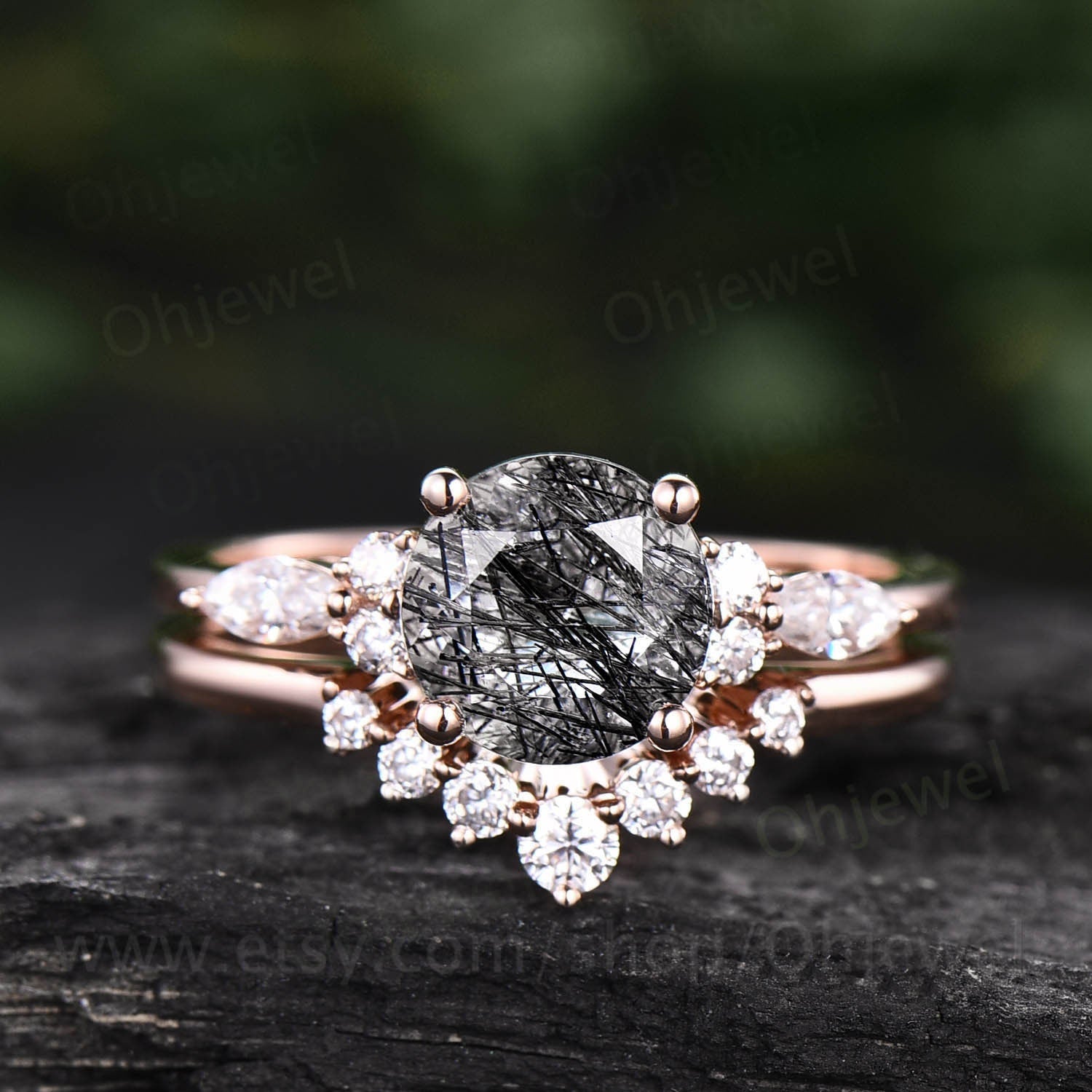 Vintage black rutilated quartz engagement ring set rose gold art deco moissanite ring for women unique wedding bridal anniversary ring set