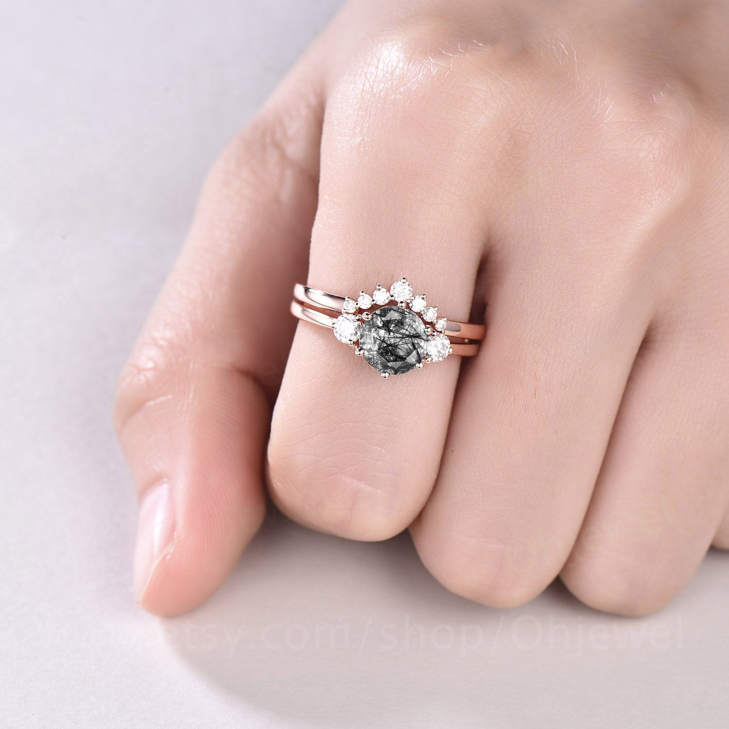 This is a Black Rutilated Quartz engagement ring in solid gold,about 7mm round cut. The accent stones are round moissanites.