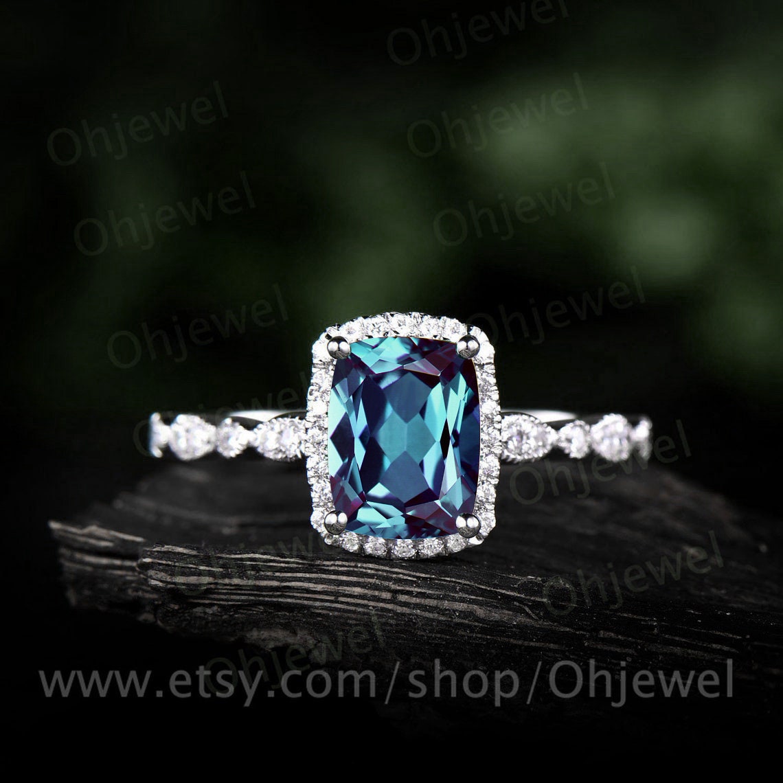Vintage cushion cut alexandrite engagement ring white gold halo art deco half eternity diamond ring unique promise wedding ring for women