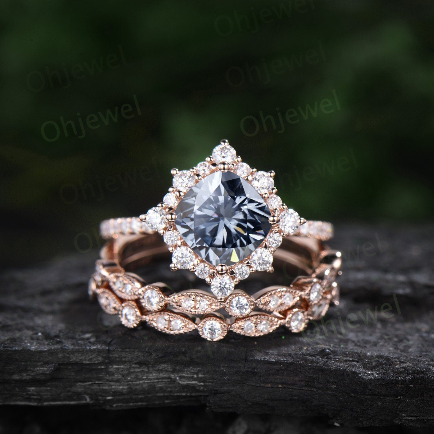Vintage cushion cut gray moissanite engagement ring rose gold halo snowdrift moissanite ring unique bridal set half eternity ring women