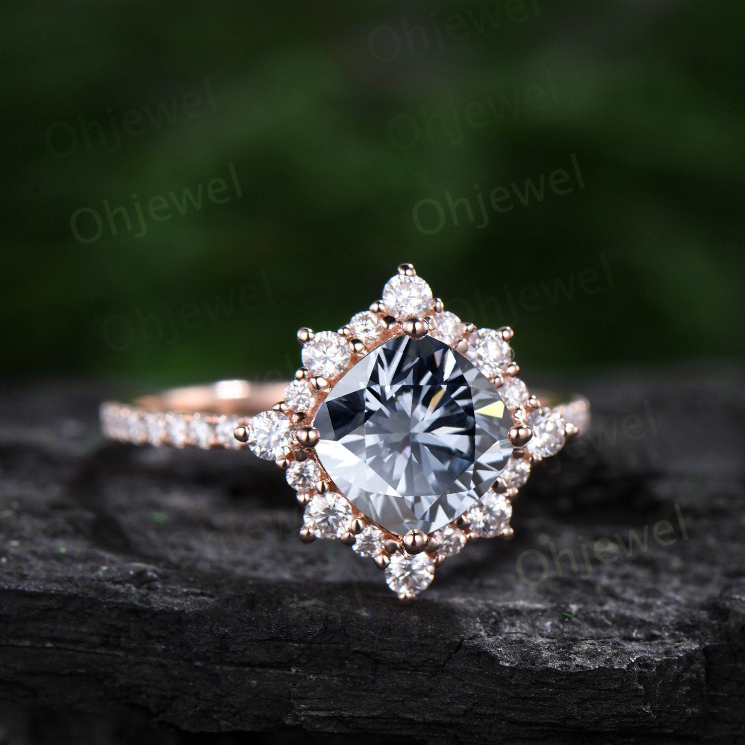 This is a gray moissanite engagement ring in solid gold,about 7mm cushion cut. The accent stones are moissanites.