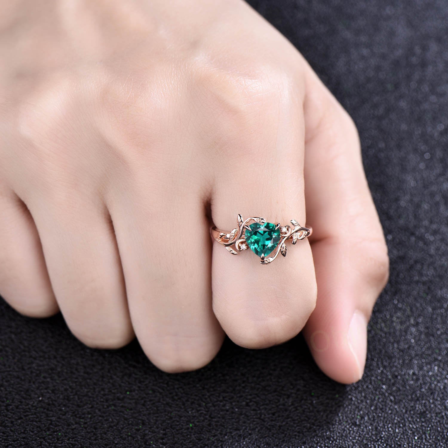 Vintage heart shaped green emerald engagement ring solid 14k rose gold three stone leaf moon diamond bridal wedding promise ring women gift