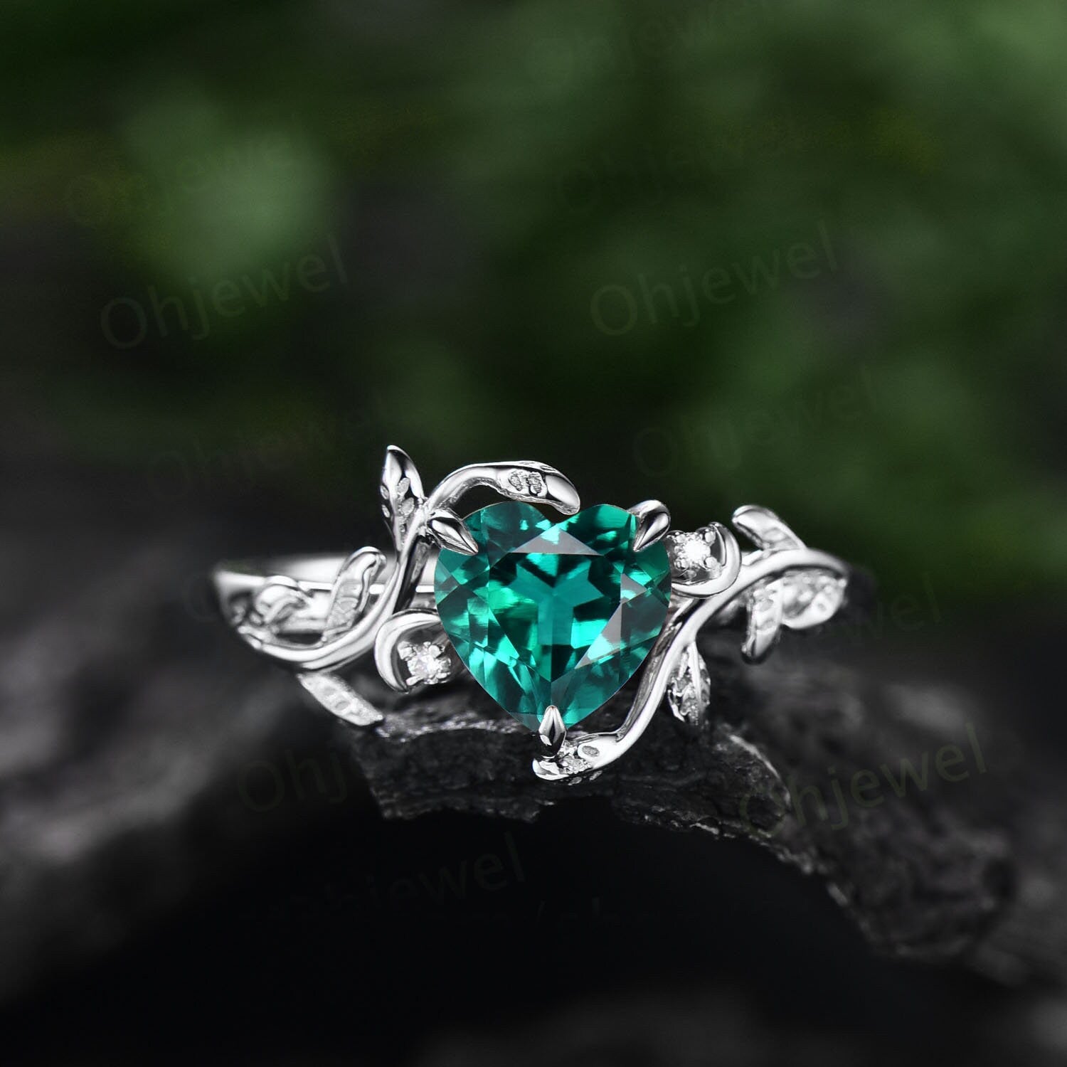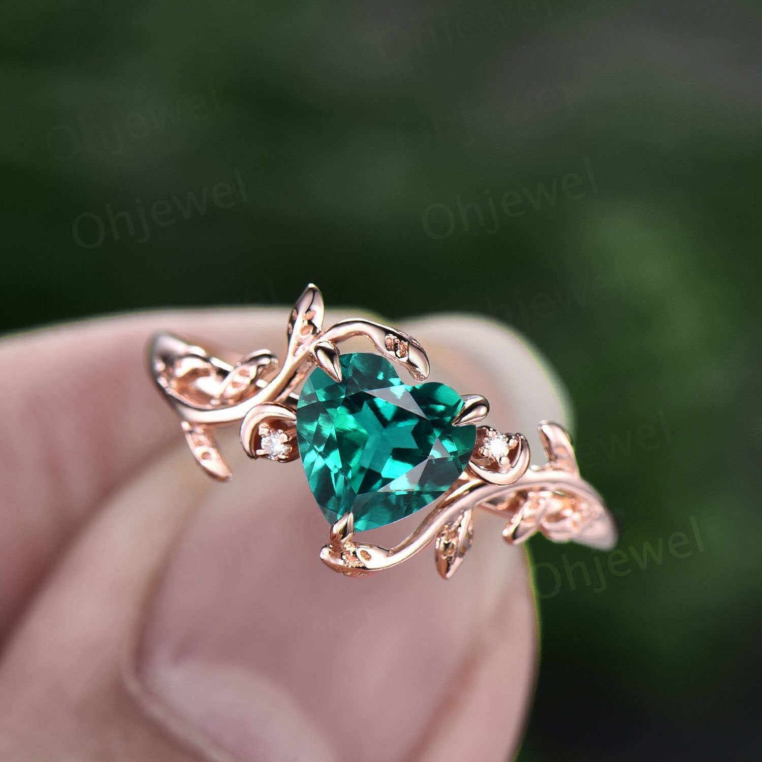 This is a lab green emerald engagement ring in solid gold,about 6.5mm Heart shaped,about 1ct.