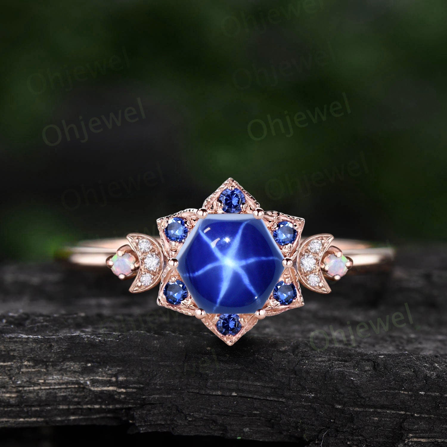 Vintage Hexagon blue star sapphire engagement ring solid 14k yellow gold milgrain floral moon opal diamond ring women wedding ring gift