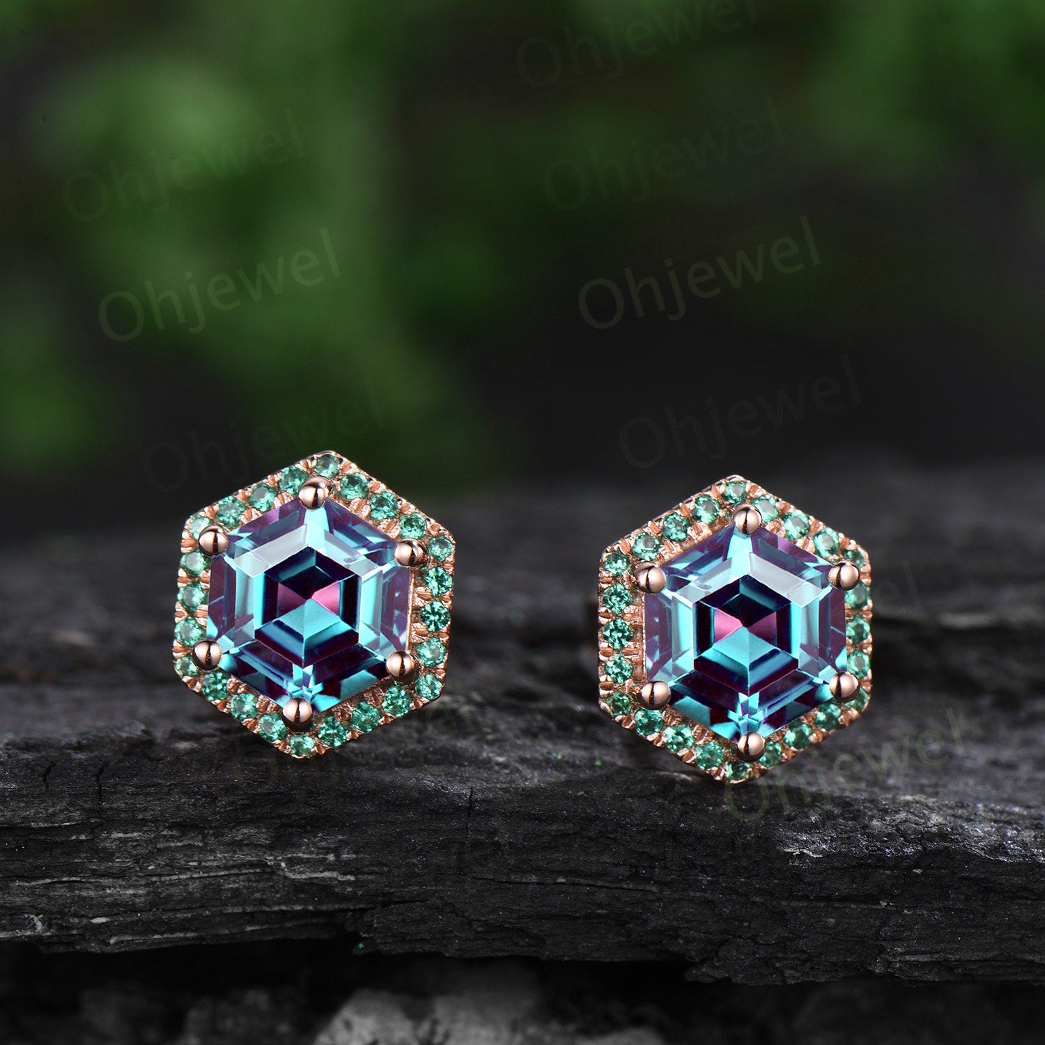 Vintage hexagon cut Alexandrite earrings solid 14k 18k rose gold unique 6 prong halo emerald stud earrings women wedding anniversary gift