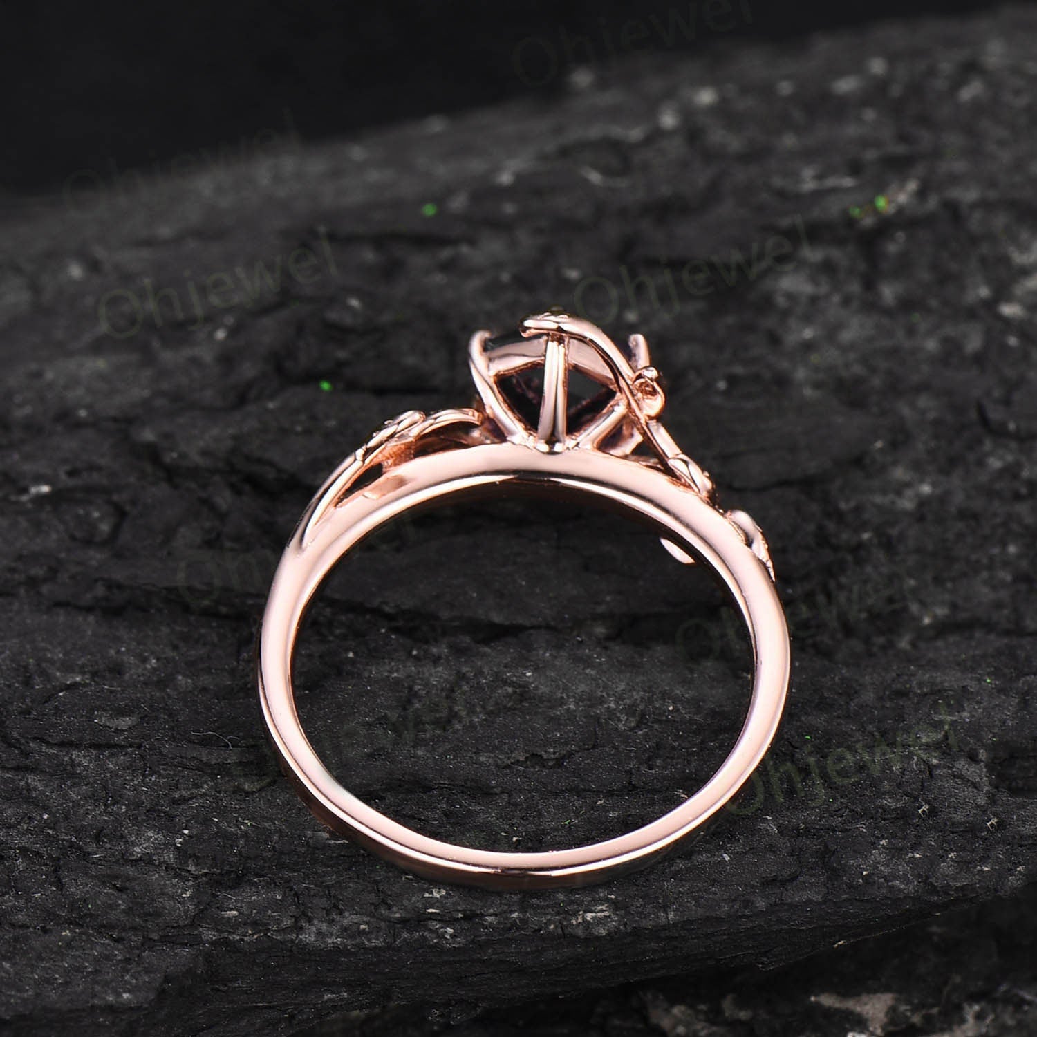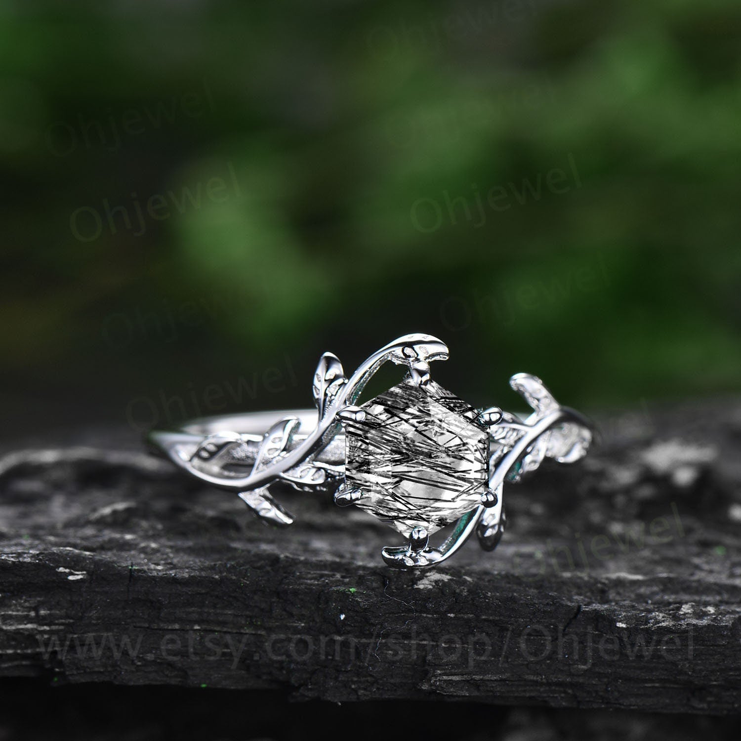Vintage Hexagon cut black rutilated quartz ring rose gold leaf nature inspired solitaire engagement ring women unique promise wedding ring