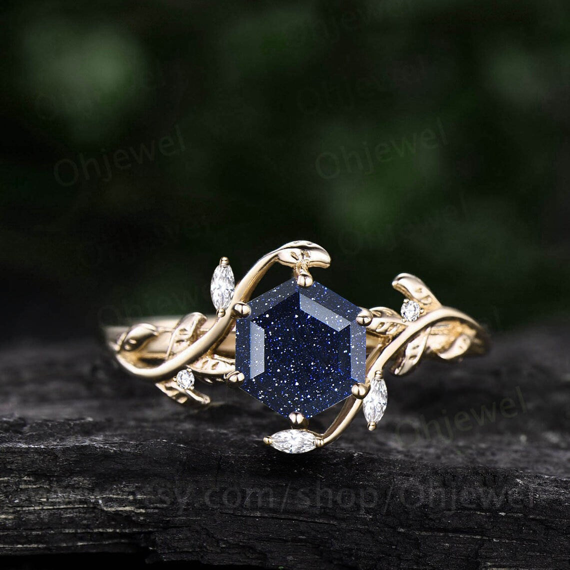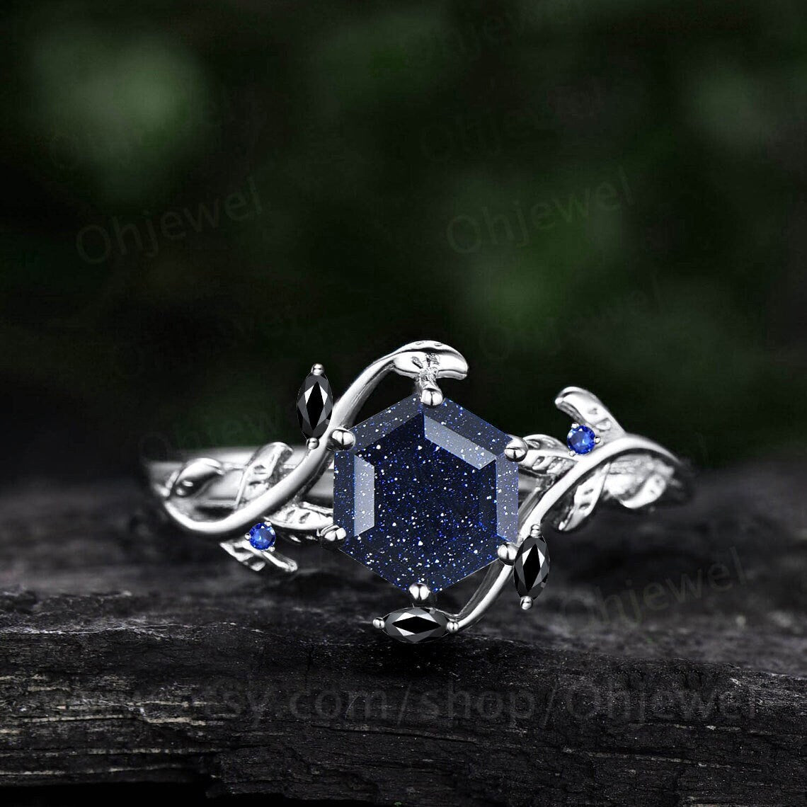 Vintage Hexagon cut blue sandstone engagement ring nature inspired sapphire ring women leaf white gold branch bridal wedding ring jewelry