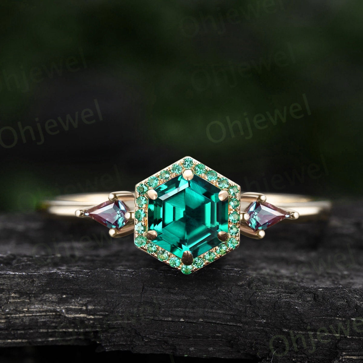 Vintage Hexagon cut green emerald engagement ring yellow gold 6 prong halo ring kite alexandrite ring women gemstone promise ring her gift