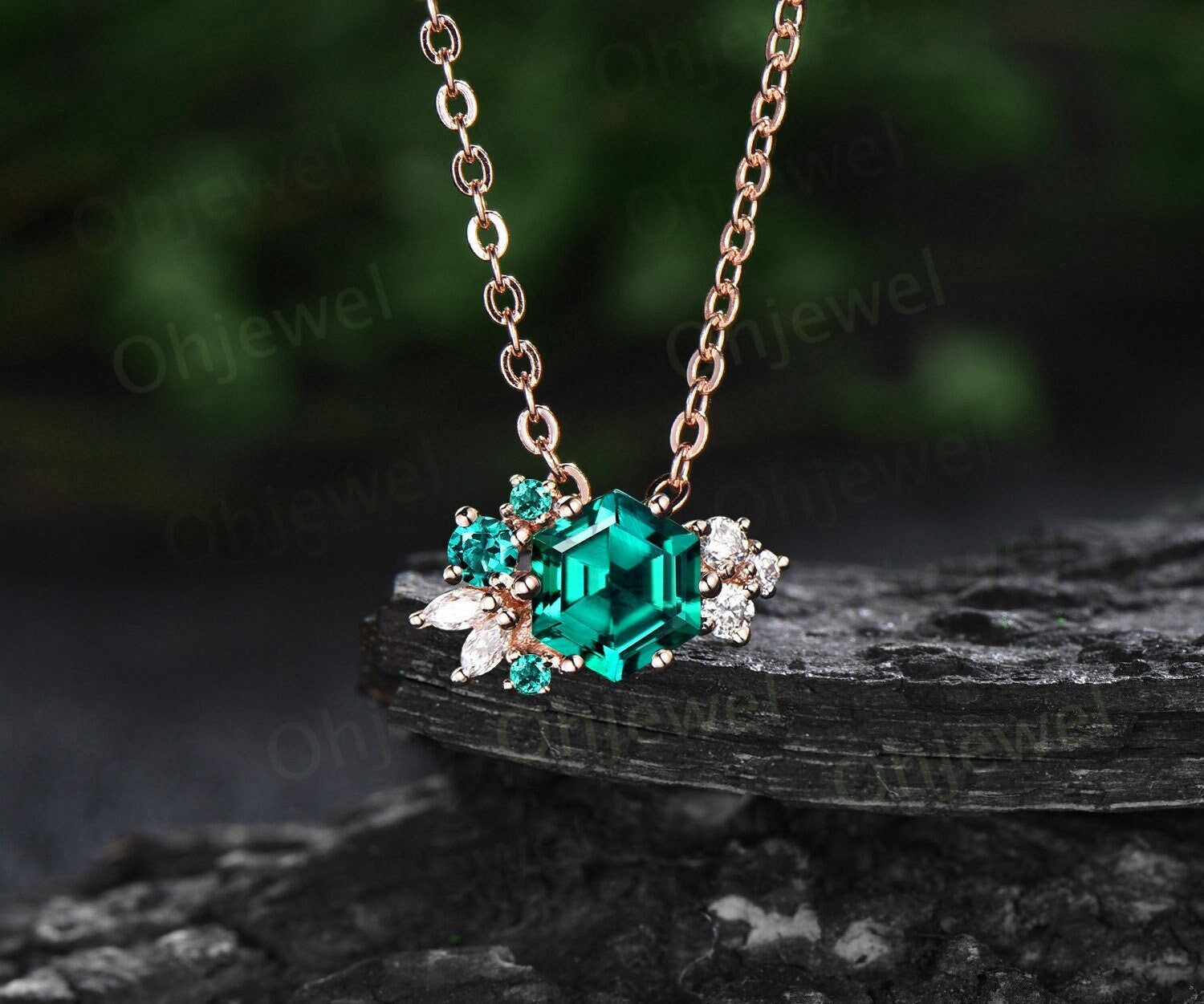 Vintage Hexagon cut green emerald necklace 14k rose gold cluster marquise diamond Pendant women 6 prong May birthstone gemstone gift her
