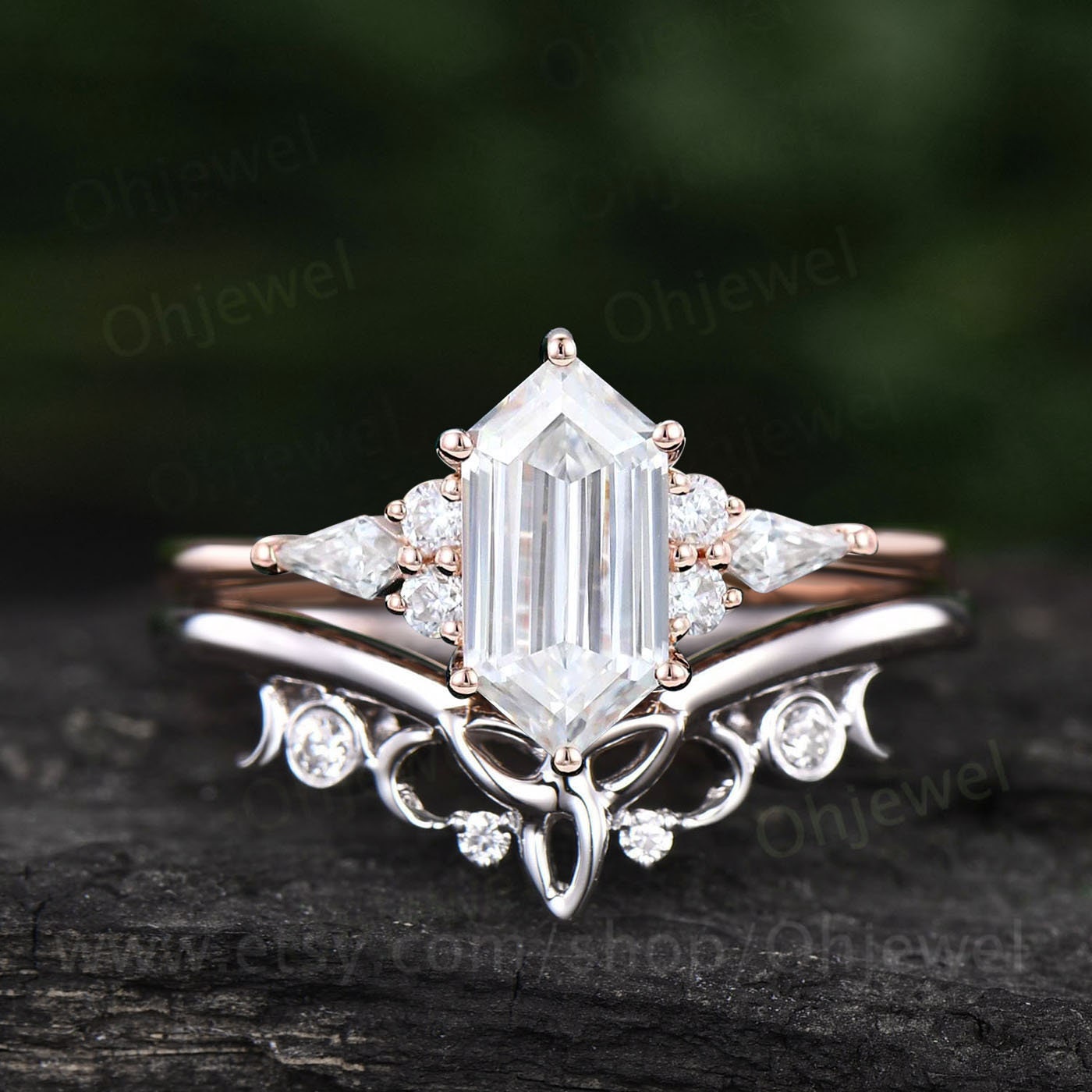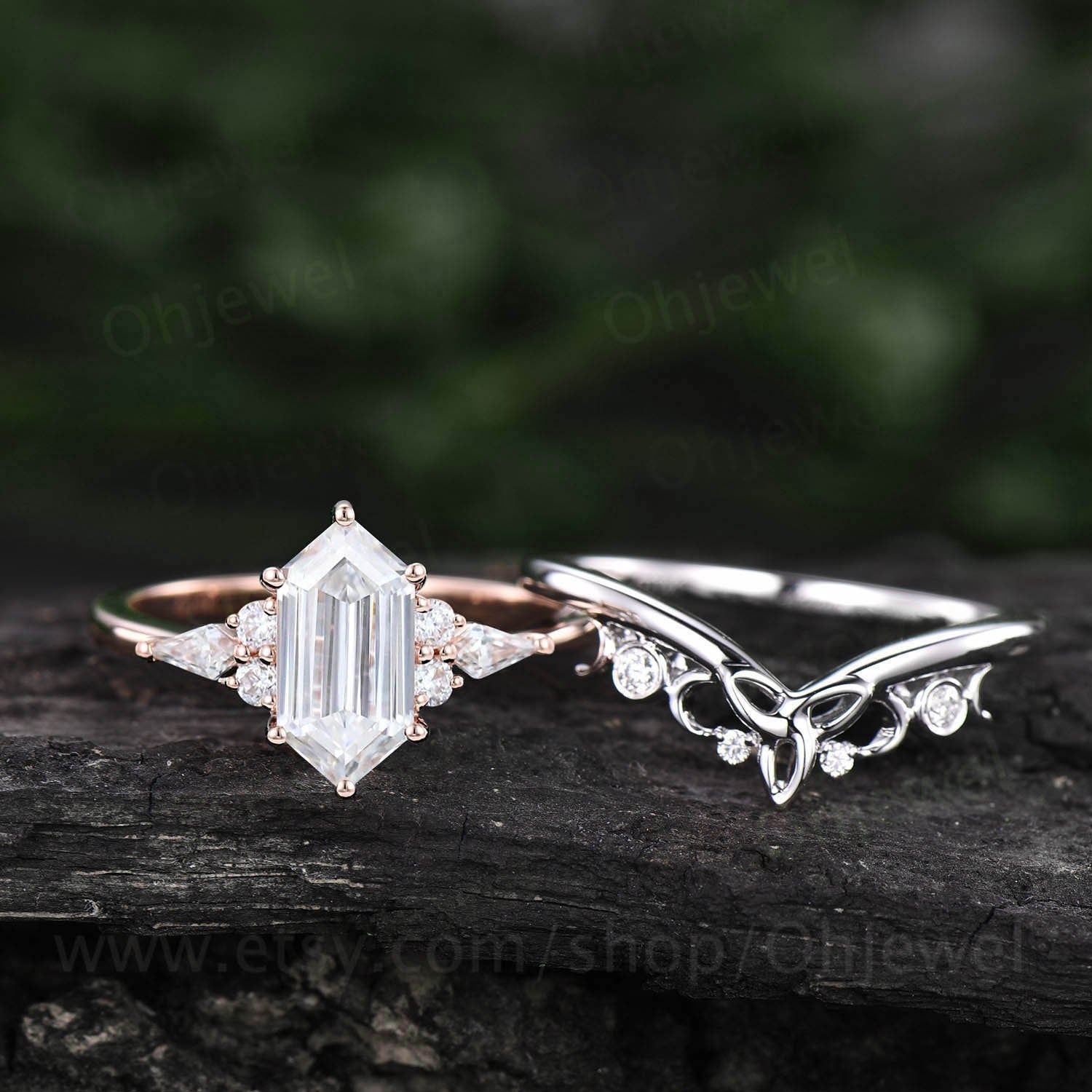 Vintage Hexagon cut Moissanite engagement ring set 14k rose gold unique anniversary ring set women dainty 6 prong kite cut ring jewelry