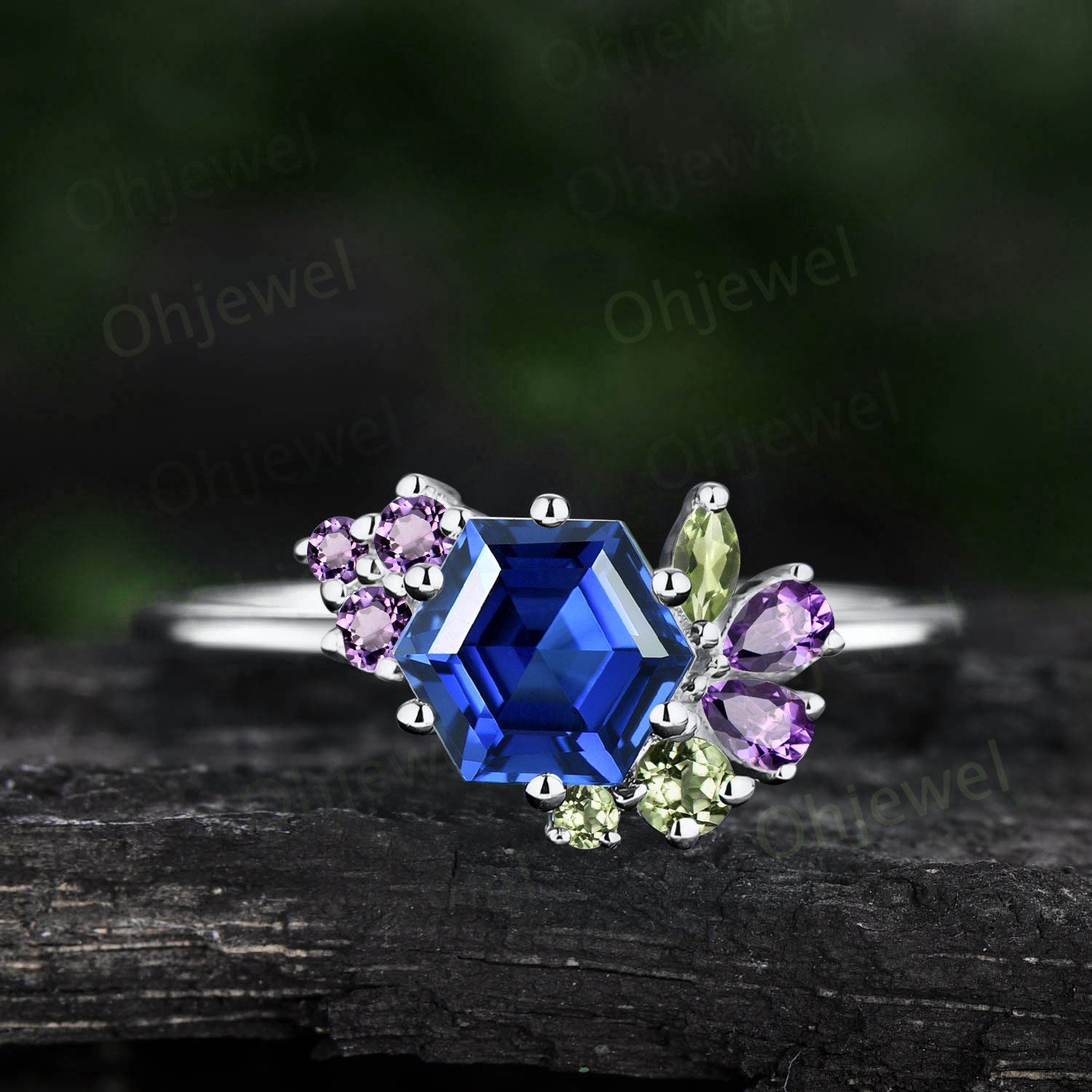 Vintage Hexagon cut sapphire engagement ring cluster amethyst peridot ring 14k rose gold women gemstone ring dainty anniversary ring gift