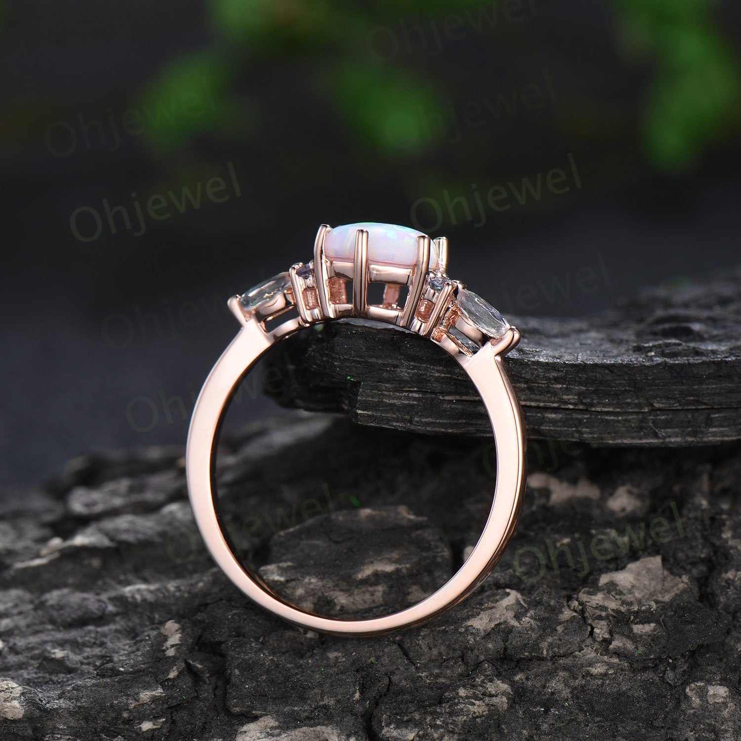 Vintage hexagon cut white opal engagement ring 14k rose gold marquise moonstone ring women dainty alexandrite bridal anniversary ring gift