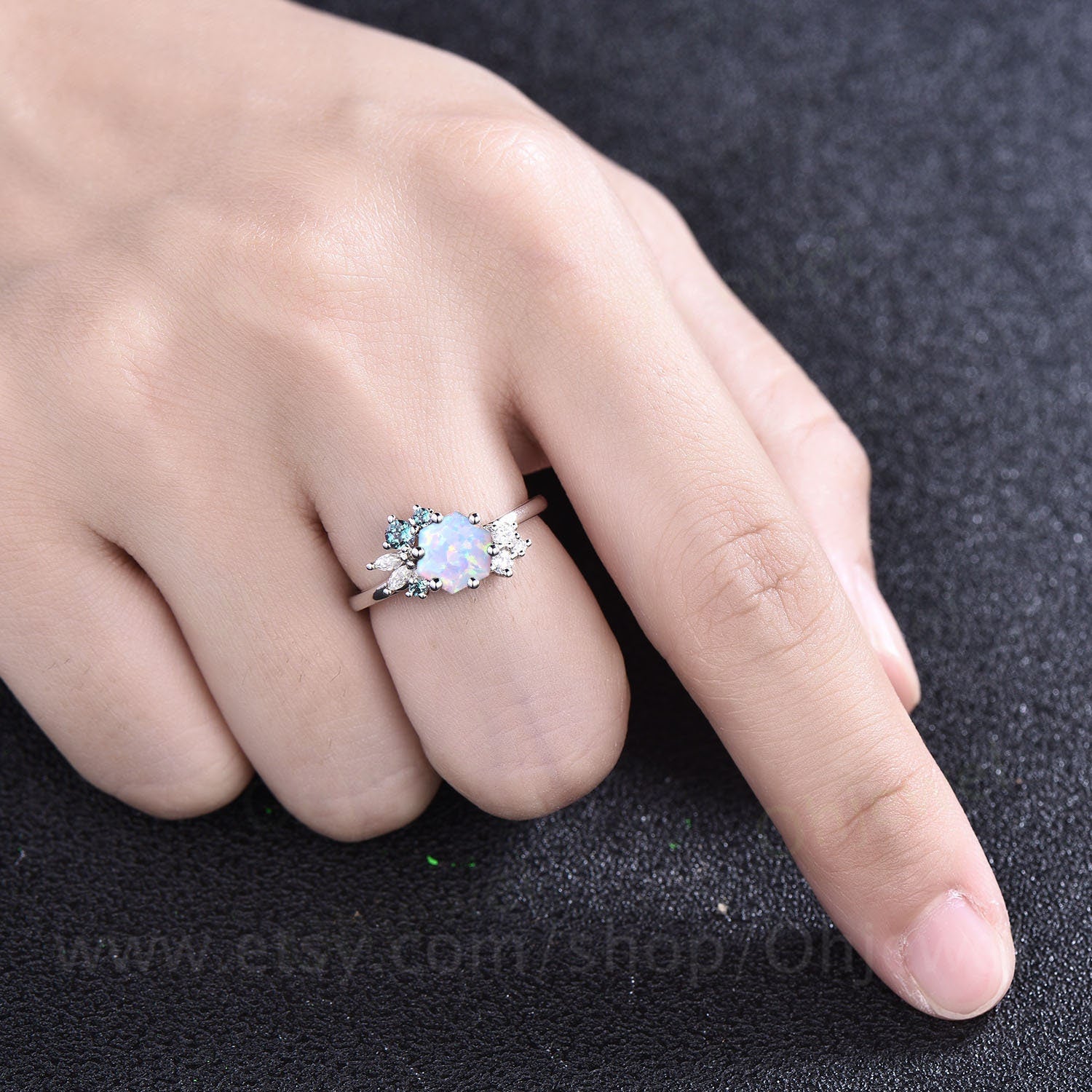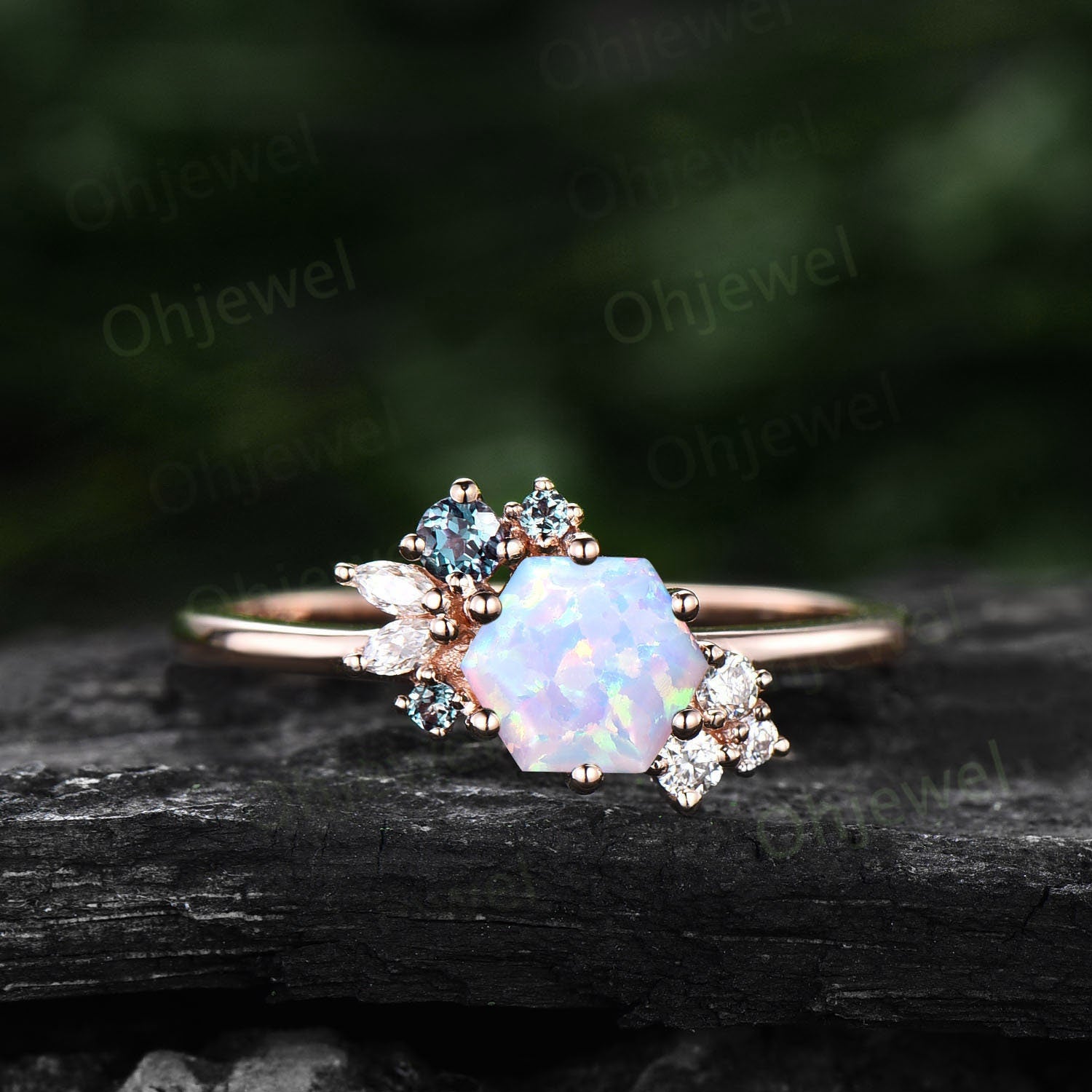 Vintage Hexagon cut white opal engagement ring 14k yellow gold cluster alexandrite marquise cut diamond ring unique anniversary ring gifts