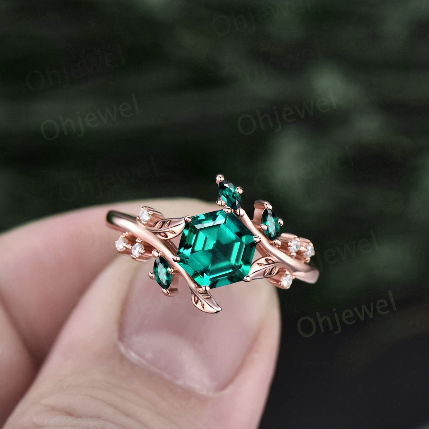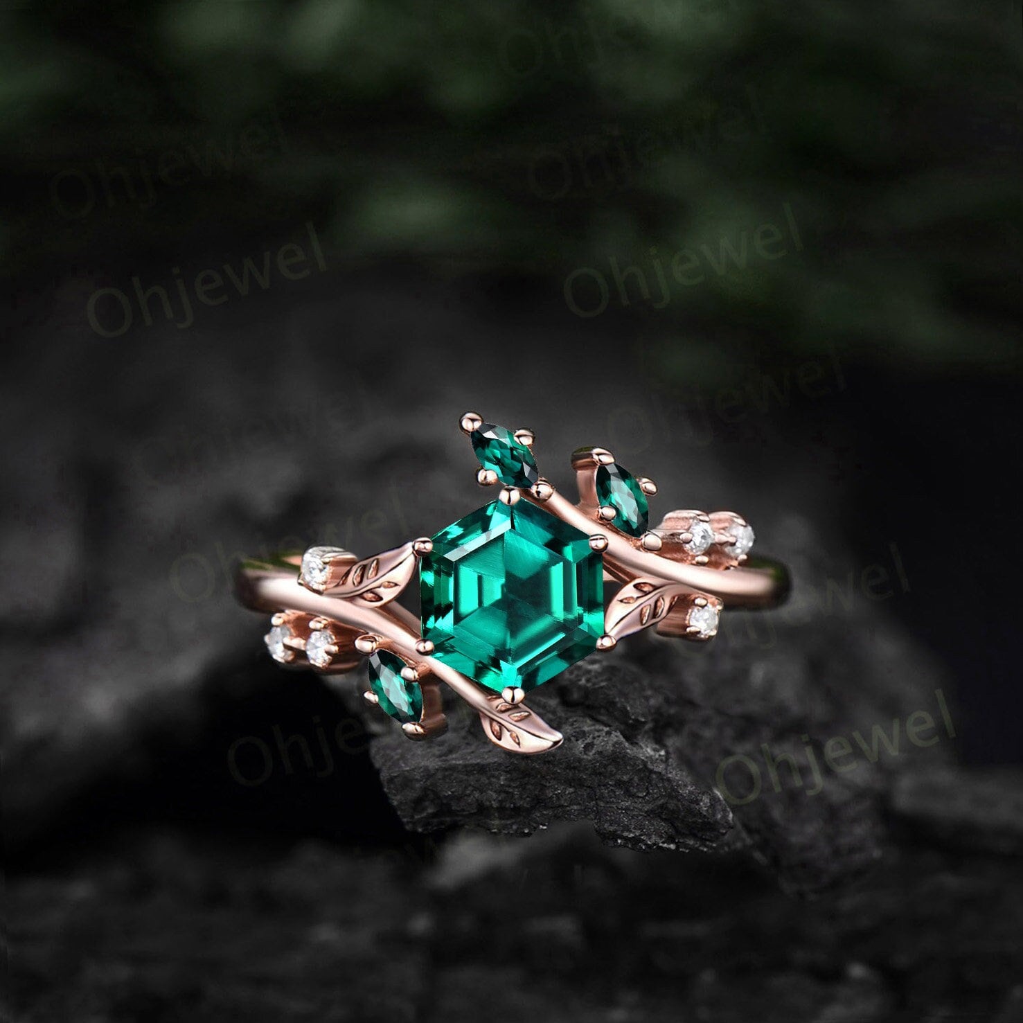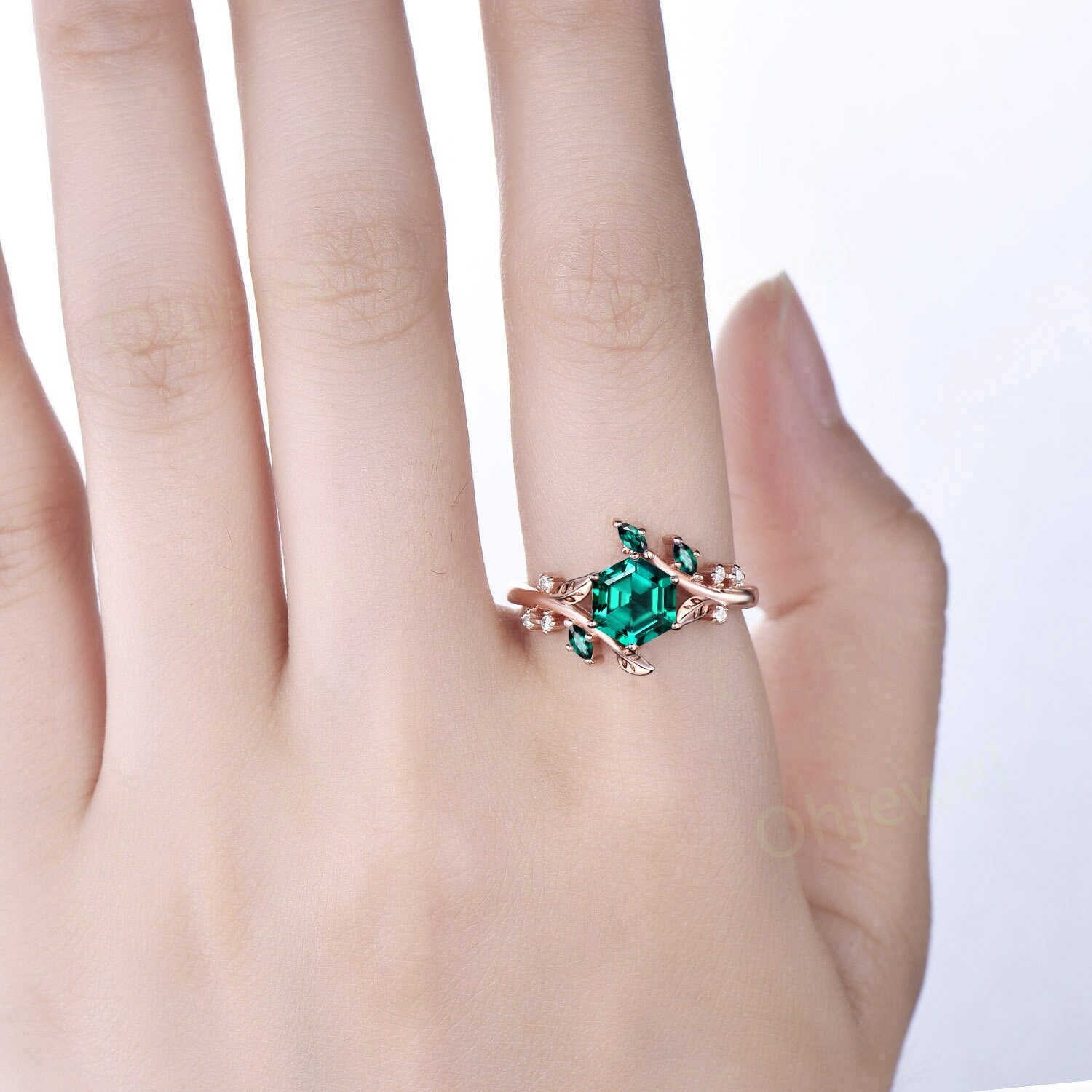 Vintage Hexagon green emerald engagement ring rose gold silver cluster diamond ring leaf nature inspired unique bridal wedding ring women