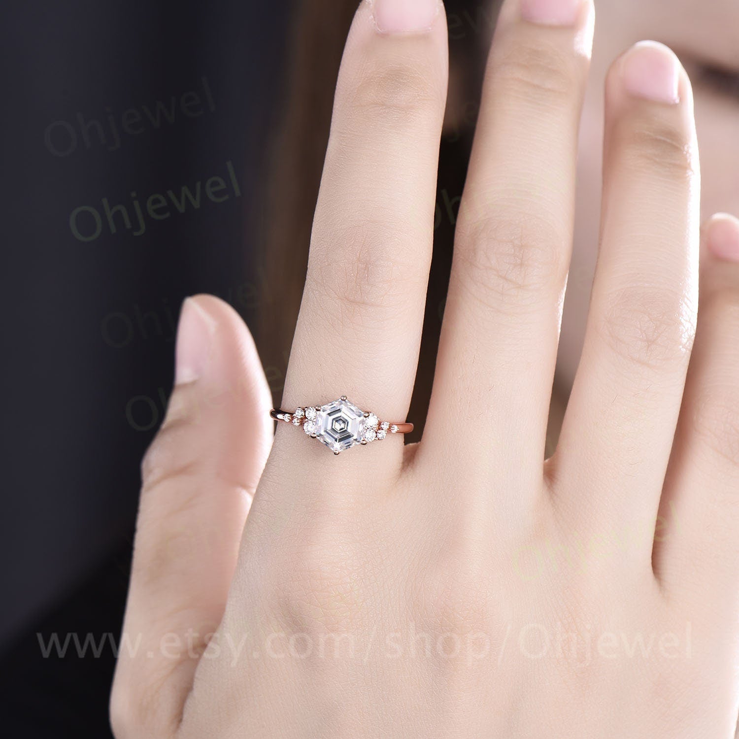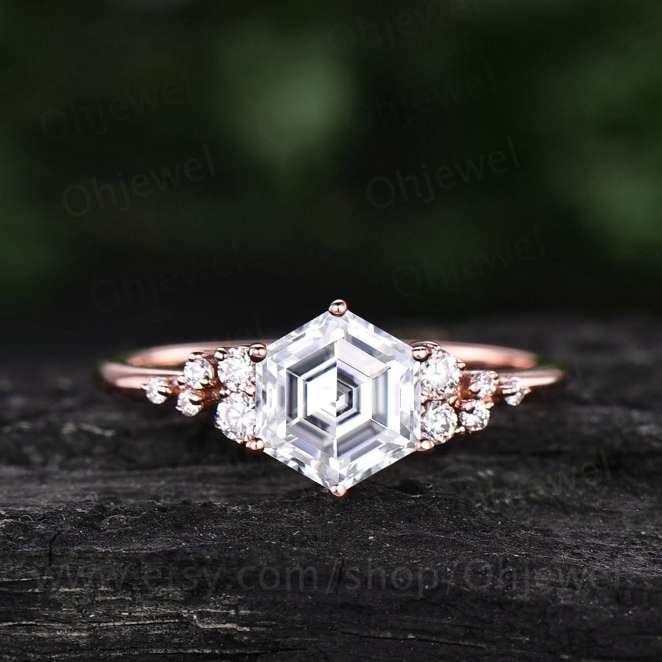 This is a 1ct moissanite engagement ring in solid gold,about 6x6mm hexagon cut.The accent stones are si-1 diamonds /moissanites.