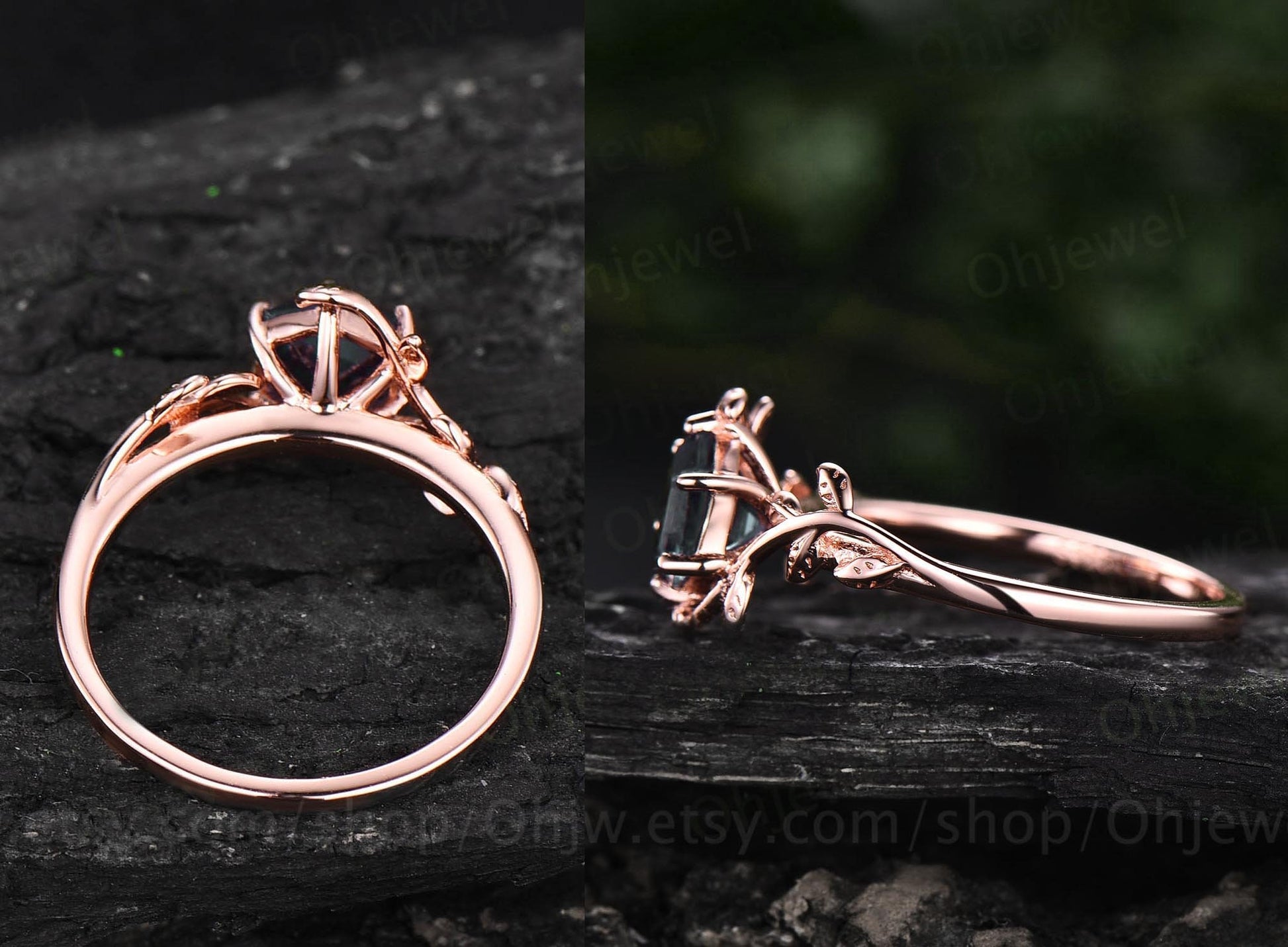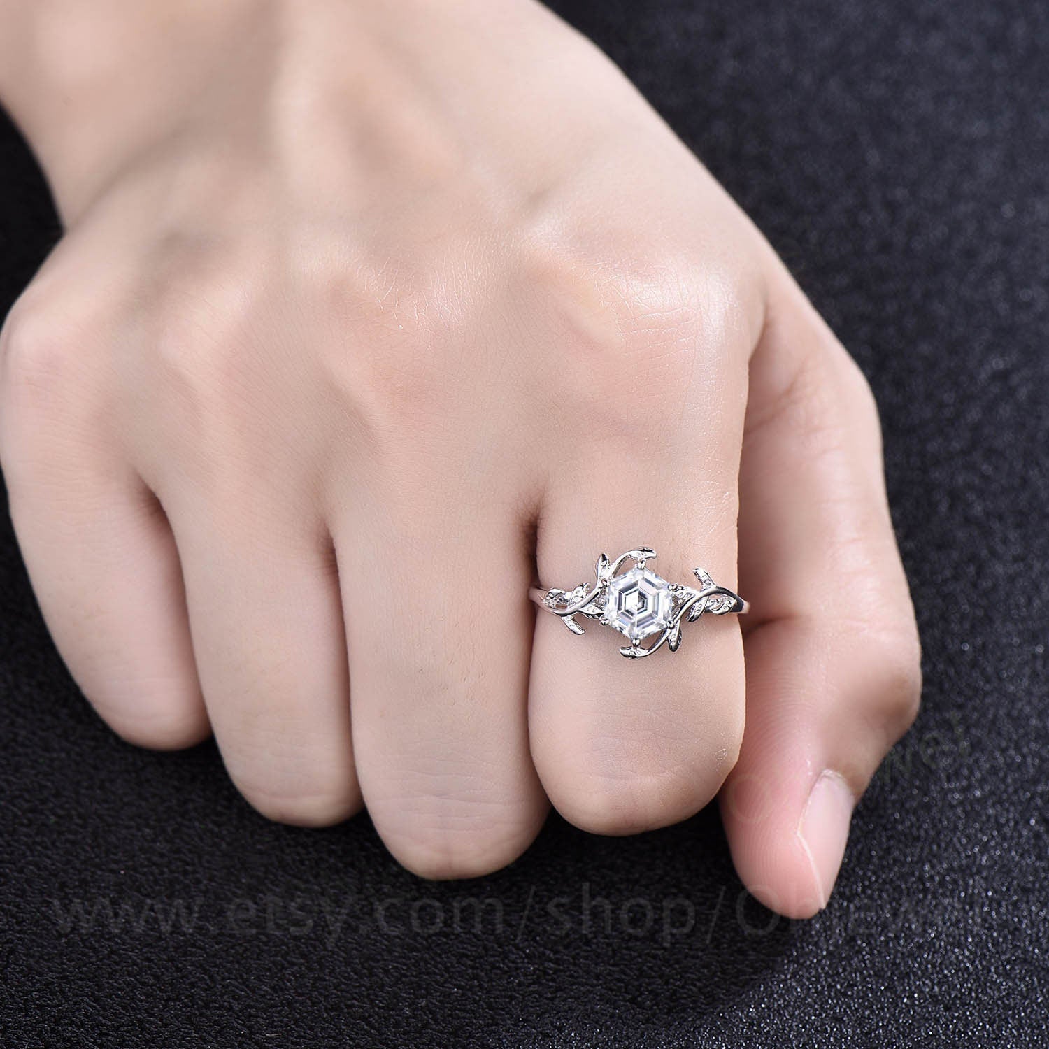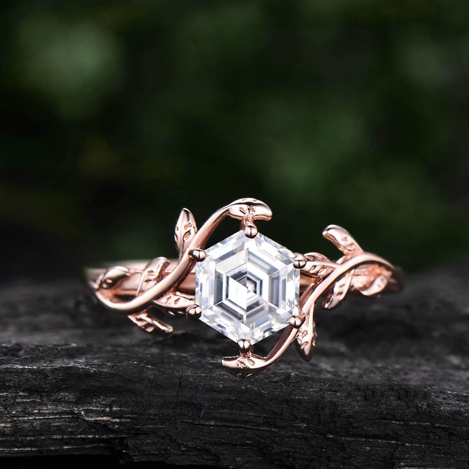Vintage Hexagon moissanite engagement ring leaf flower unique solitaire 14k rose gold engagement ring bridal wedding ring for women silver