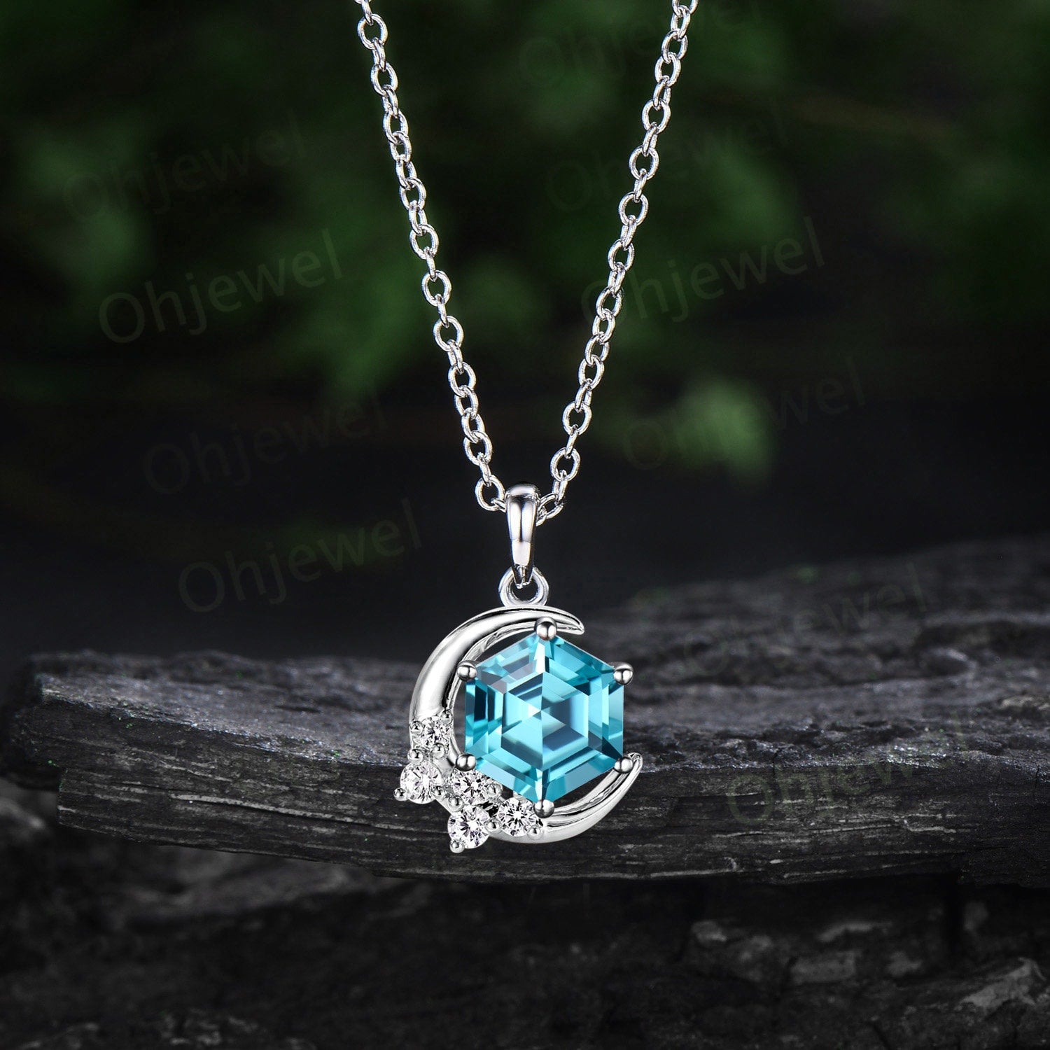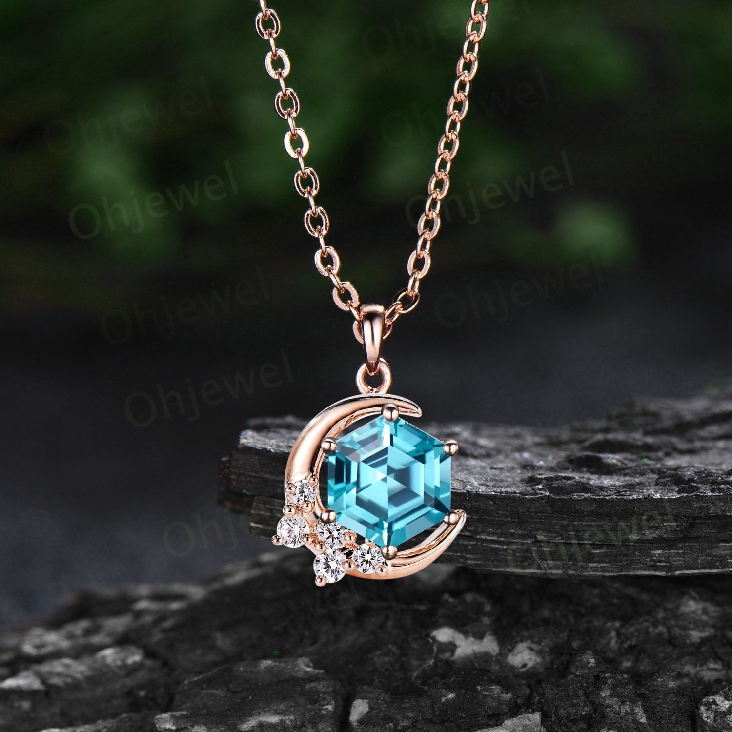 Vintage hexagon Paraiba necklace 14k rose gold Personalized dainty moon cluster diamond unique Pendant women birthday anniversary gift