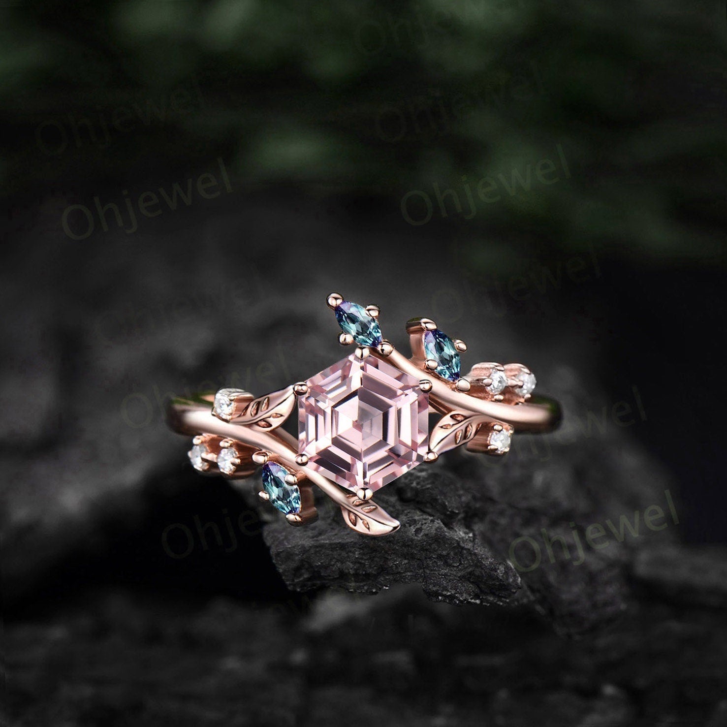 Vintage Hexagon pink sapphire engagement ring 14k rose gold cluster Alexandrite ring leaf nature inspired unique bridal wedding ring women