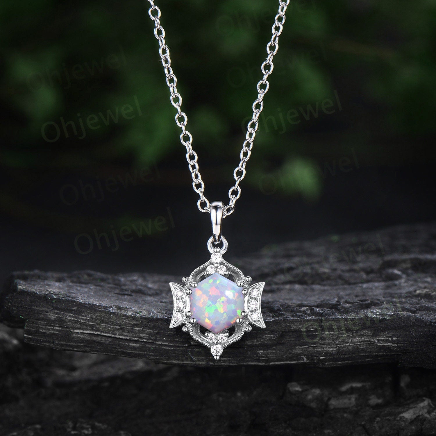 Vintage hexagon white opal necklace 14k rose gold 6 prong cluster halo moon diamond necklace Pendant women antique jewelry bridal gift