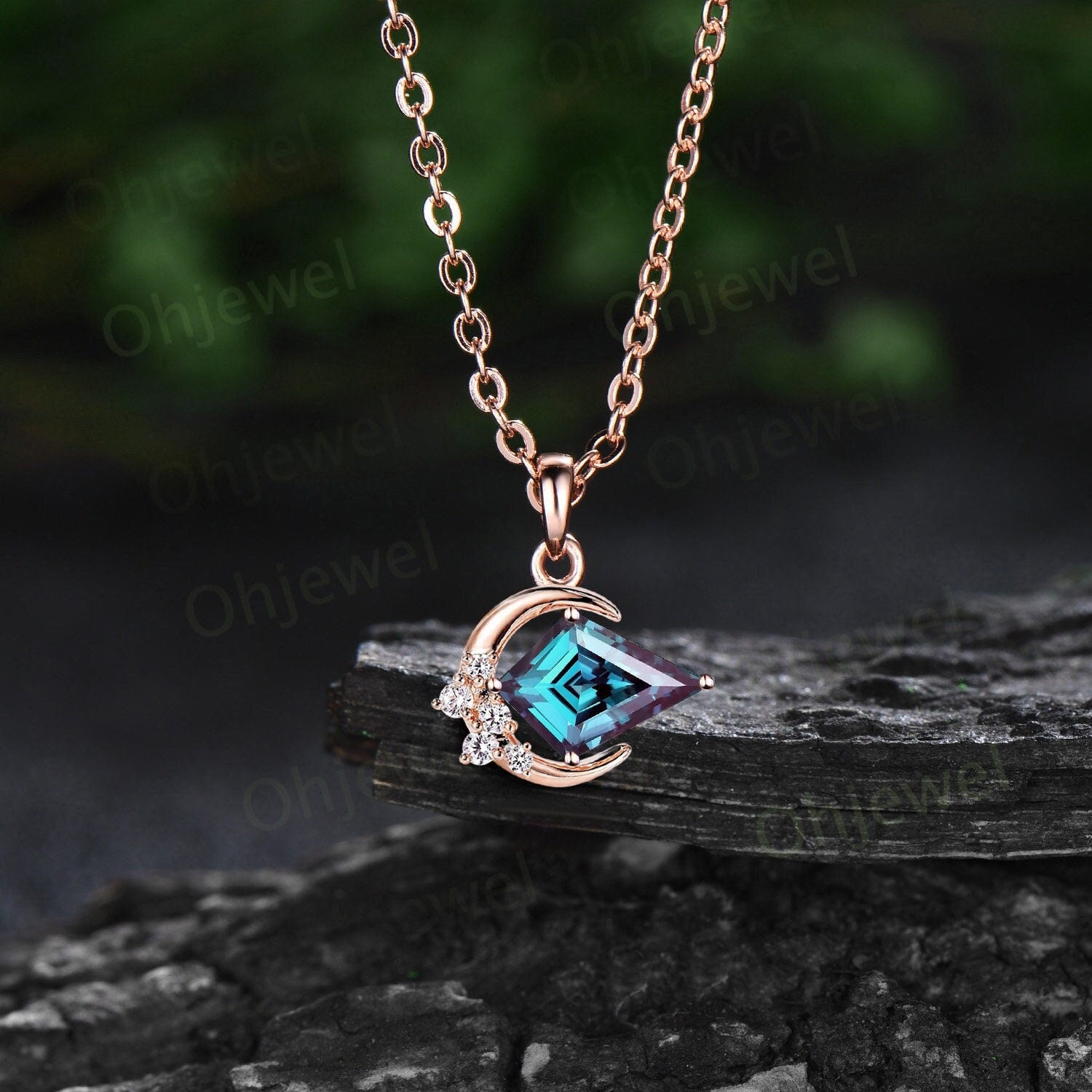 Vintage kite cut alexandrite necklace 14k rose gold Personalized moon cluster diamond unique East To West Pendant women anniversary gift her