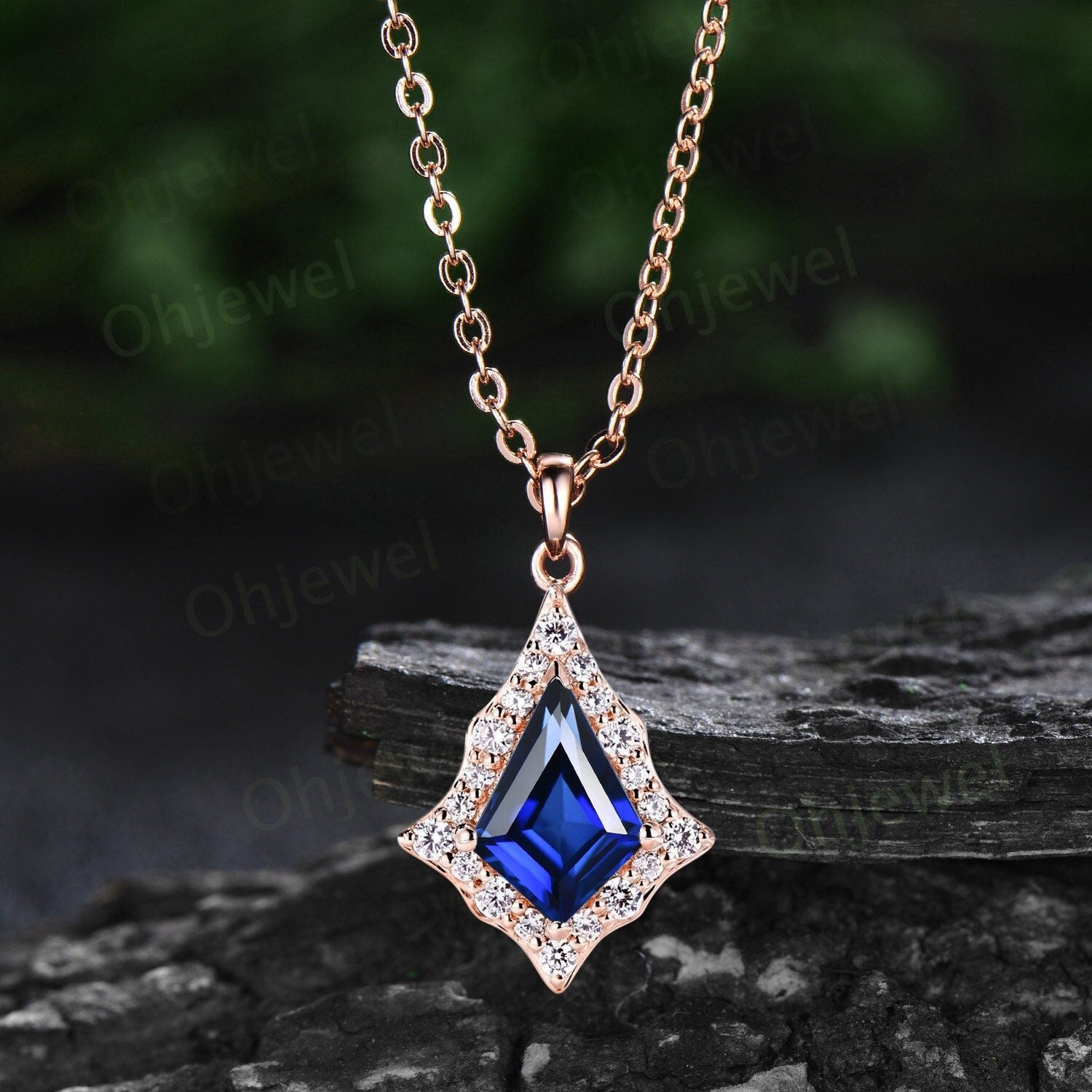 Vintage kite cut blue sapphire necklace rose gold antique unique snowdrift halo diamond necklace Pendant women jewelry anniversary gift