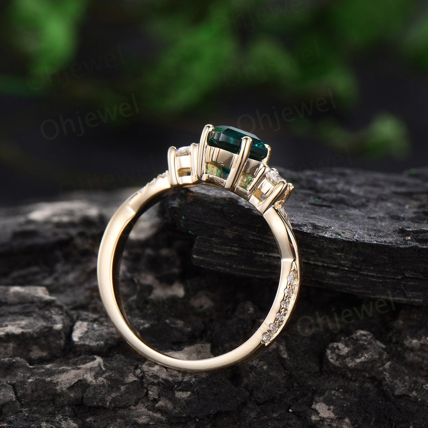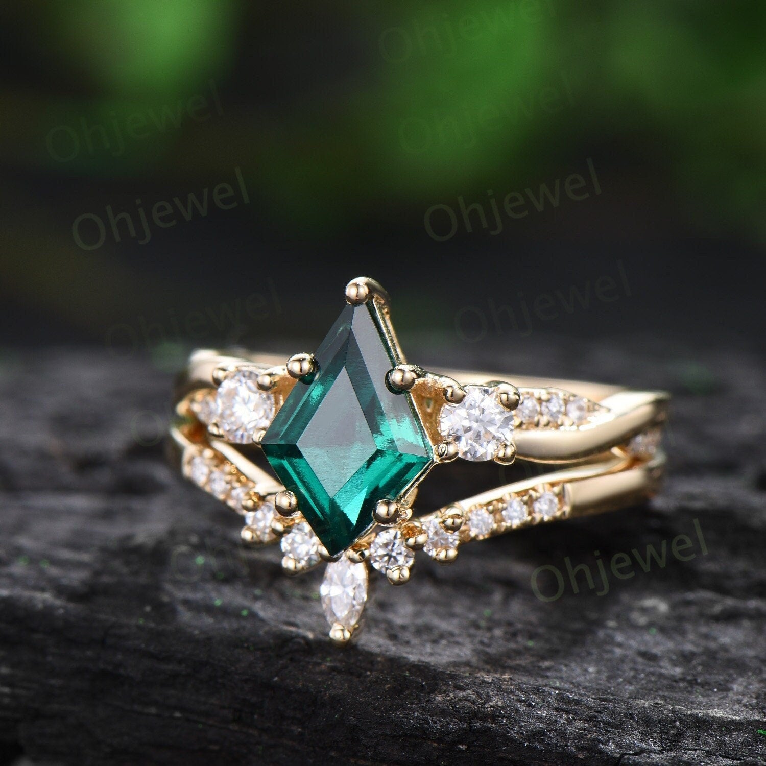Vintage kite cut green emerald engagement ring solid 14k yellow gold art deco eternity twisted diamond anniversary promise ring women gift