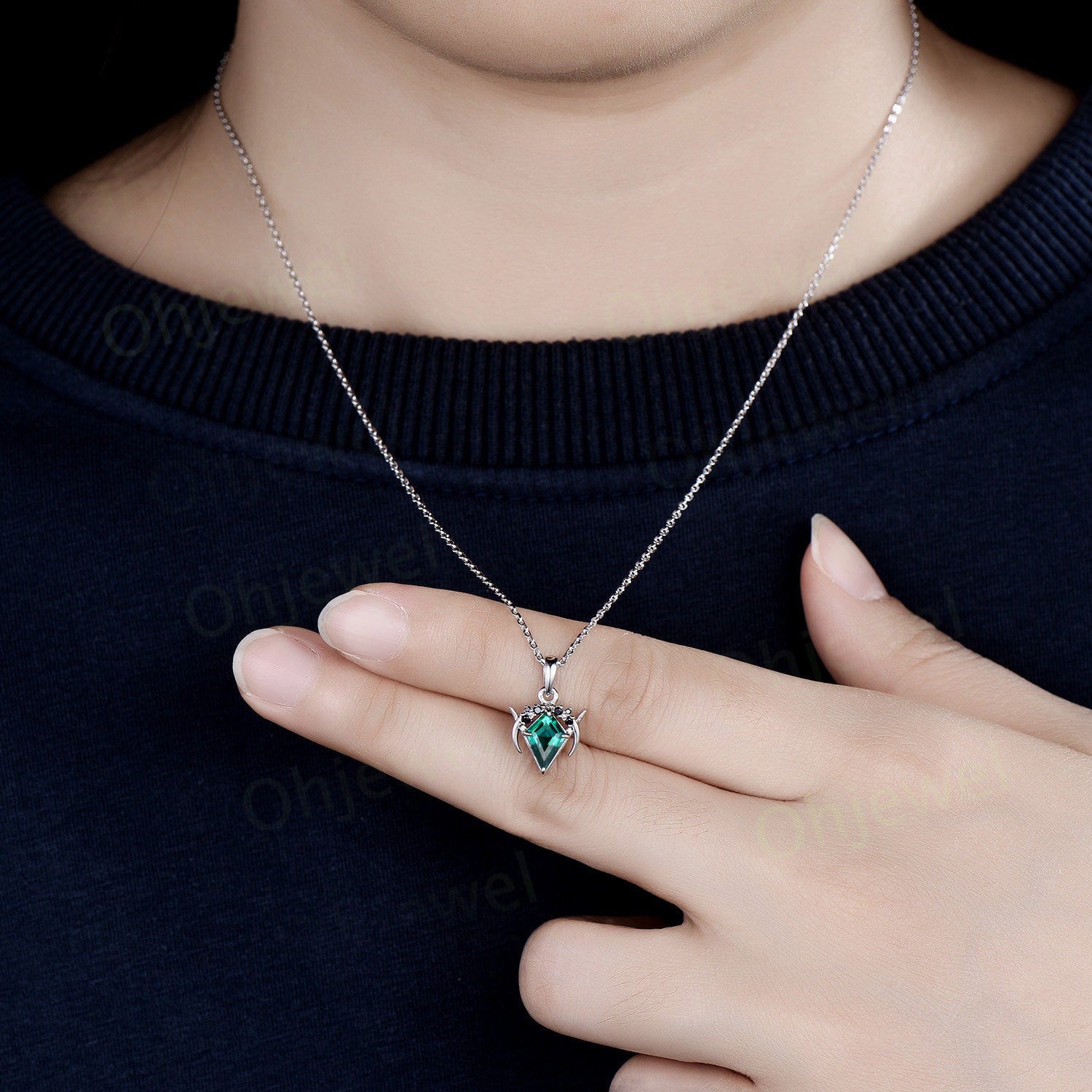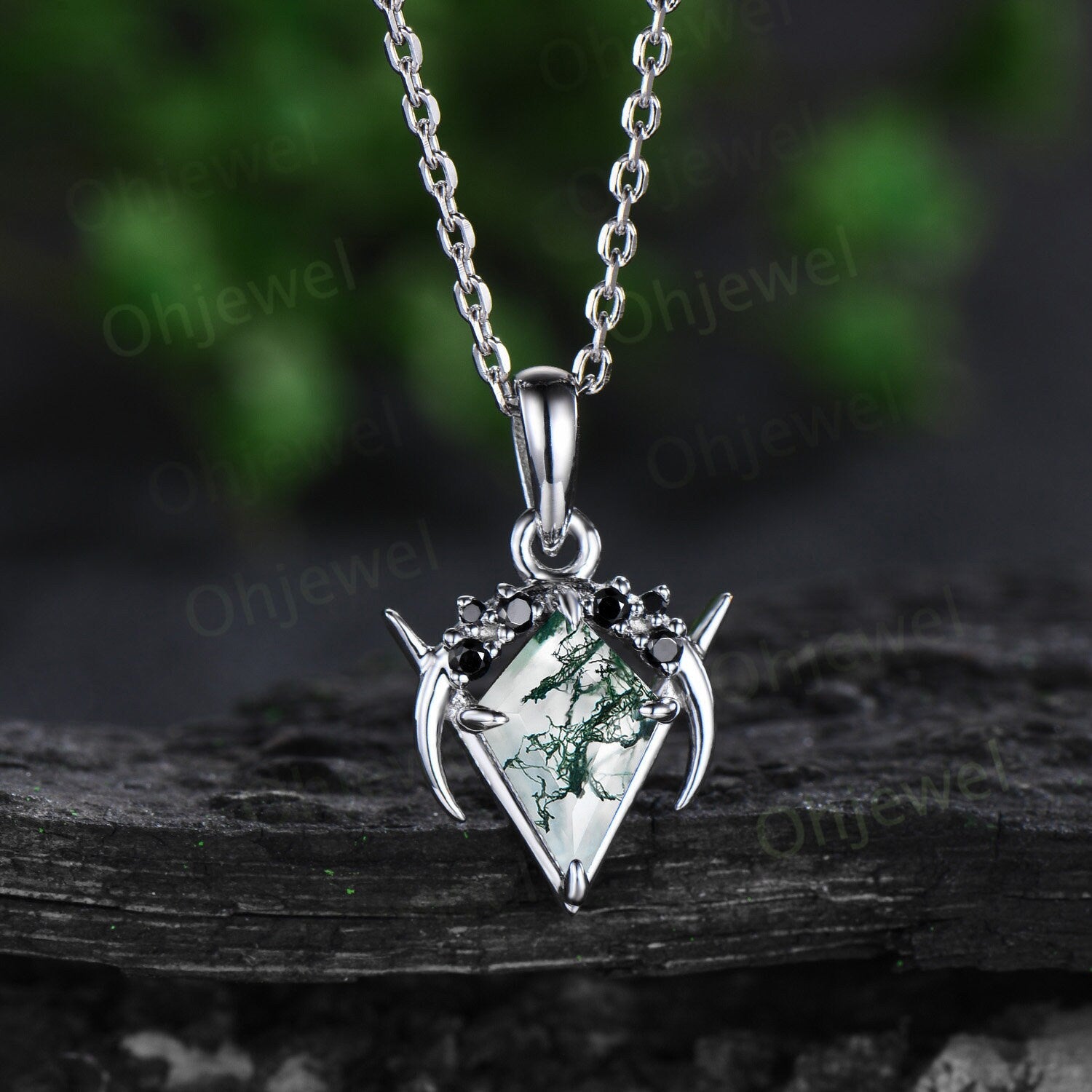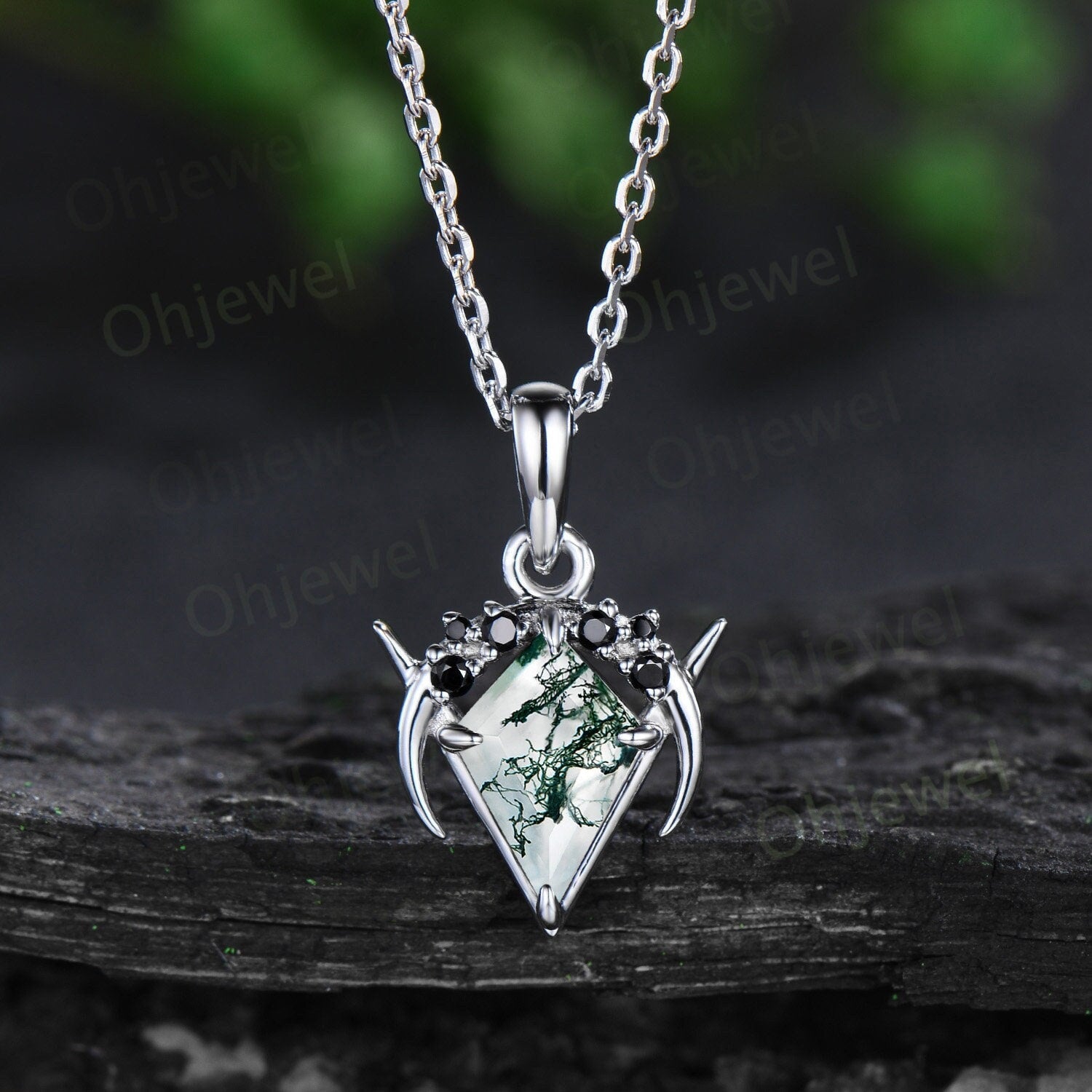 Vintage kite cut green moss agate necklace 14k white gold Personalized moon cluster black diamond unique Pendant women anniversary gift her