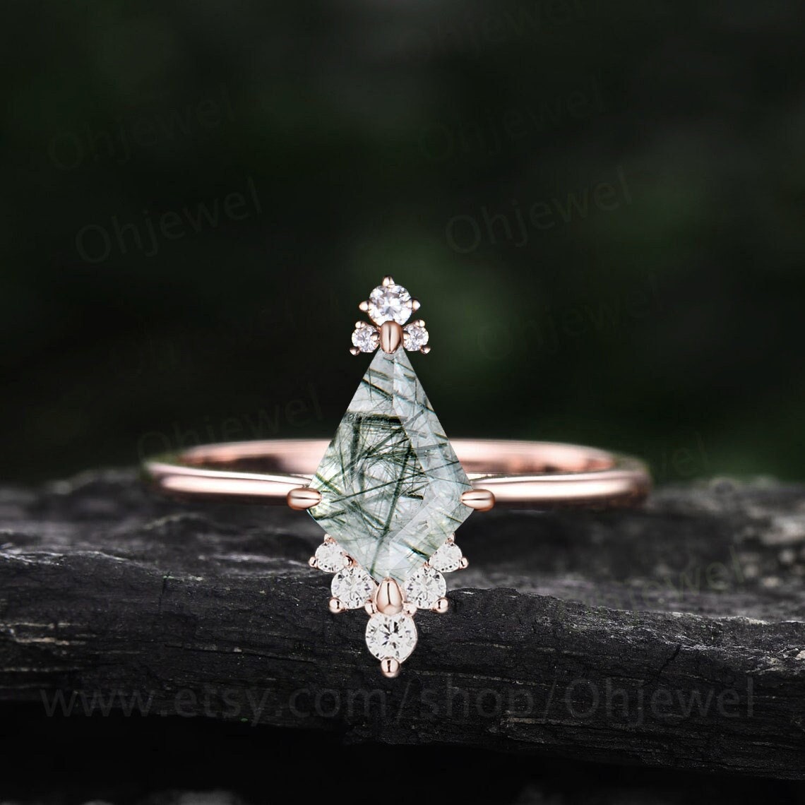 Vintage kite cut green rutilated quartz engagement ring solid rose gold Cathedral cluster diamond ring women dainty anniversary ring gift