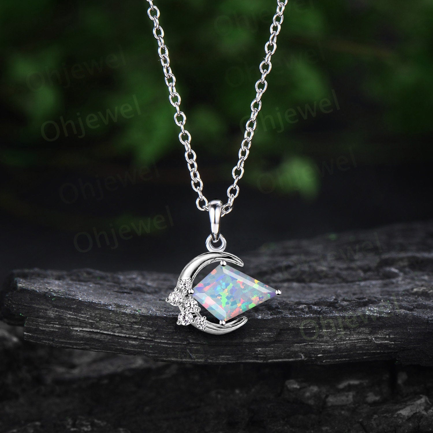 Vintage moon kite cut white opal necklace rose gold star cluster October birthstone dainty unqiue necklace Pendant women anniversary gift