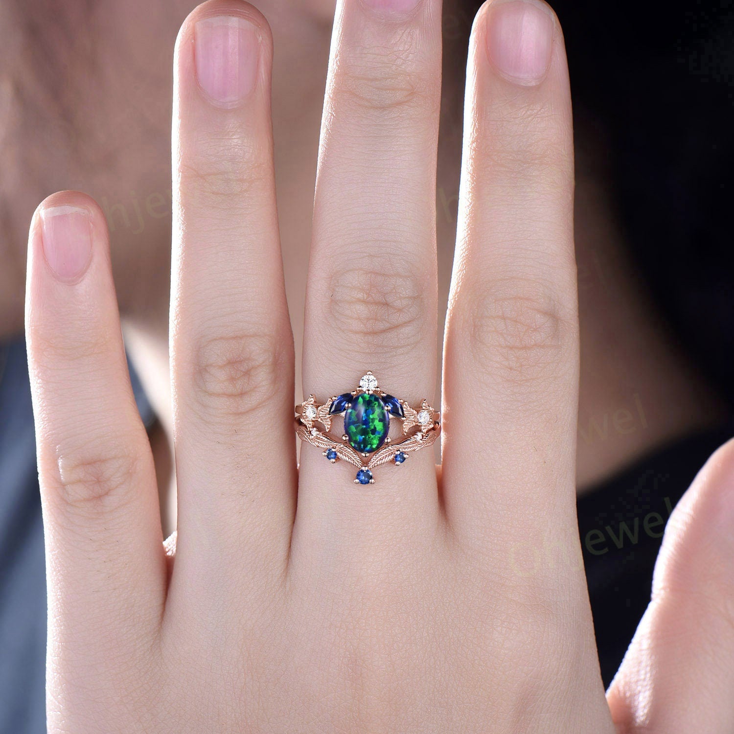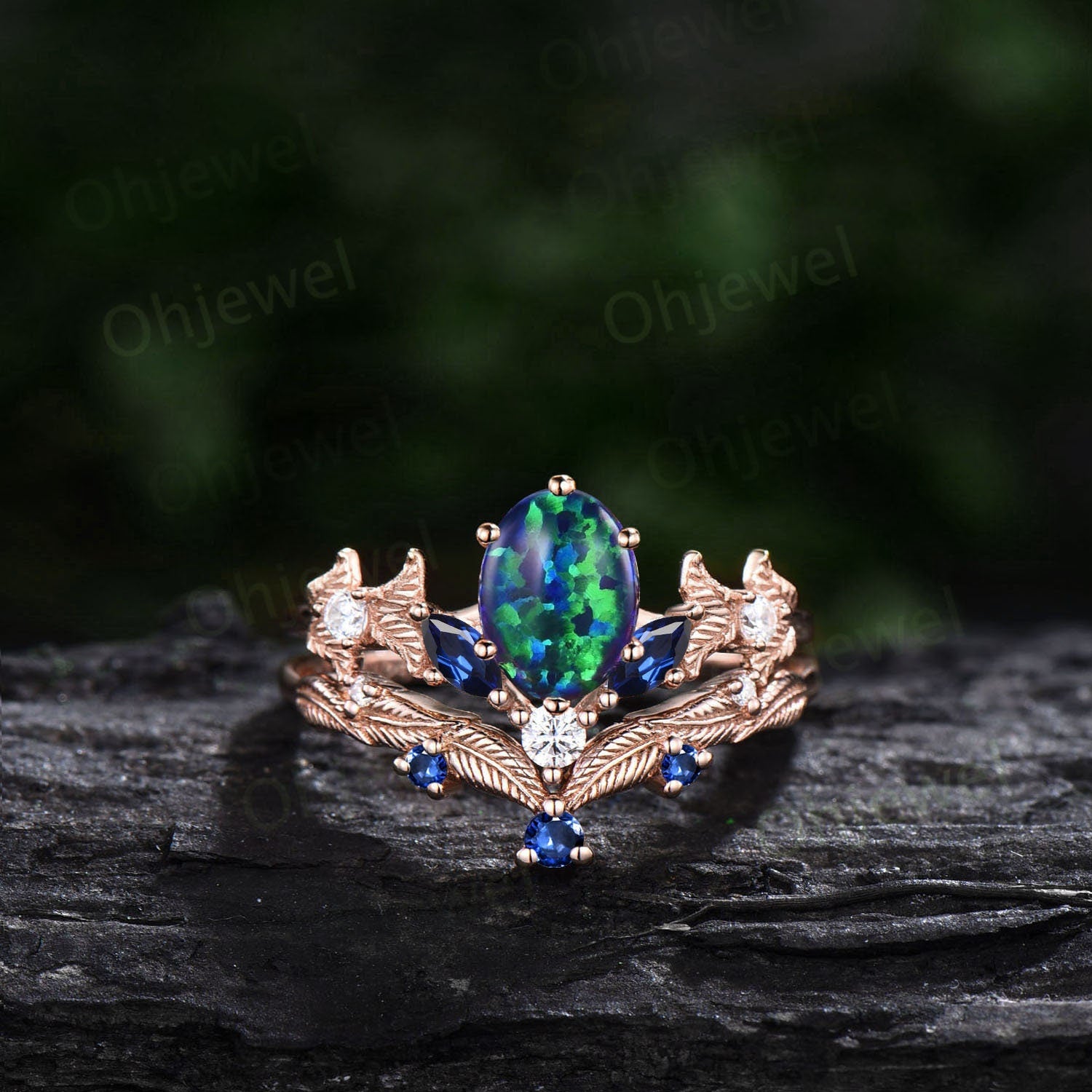 Vintage oval black opal engagement ring set rose gold twig marquise cut sapphire ring branch leaf moissanite wedding bridal ring set women