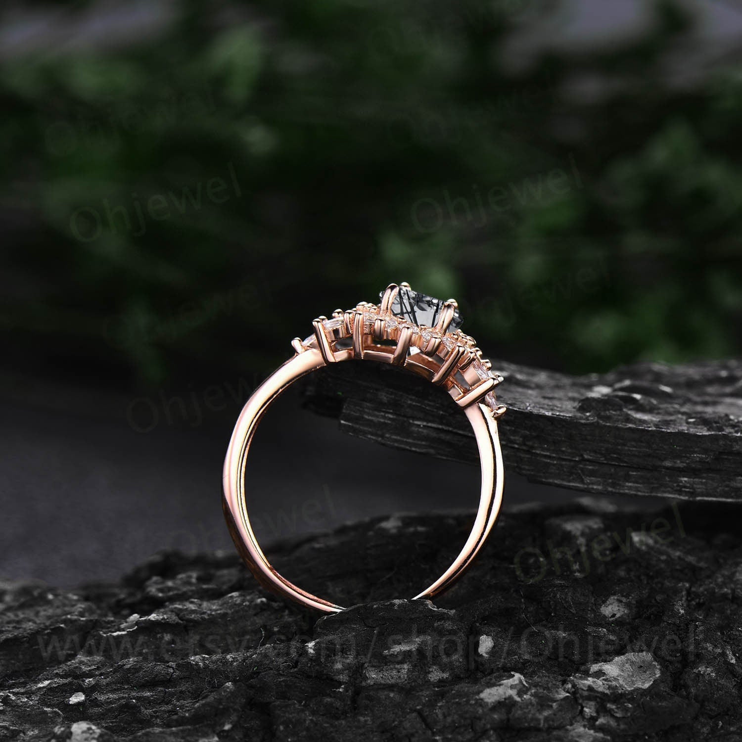 Vintage oval black rutilated quartz ring engagement ring unique halo marquise rose gold engagement ring women moissanite anniversary ring