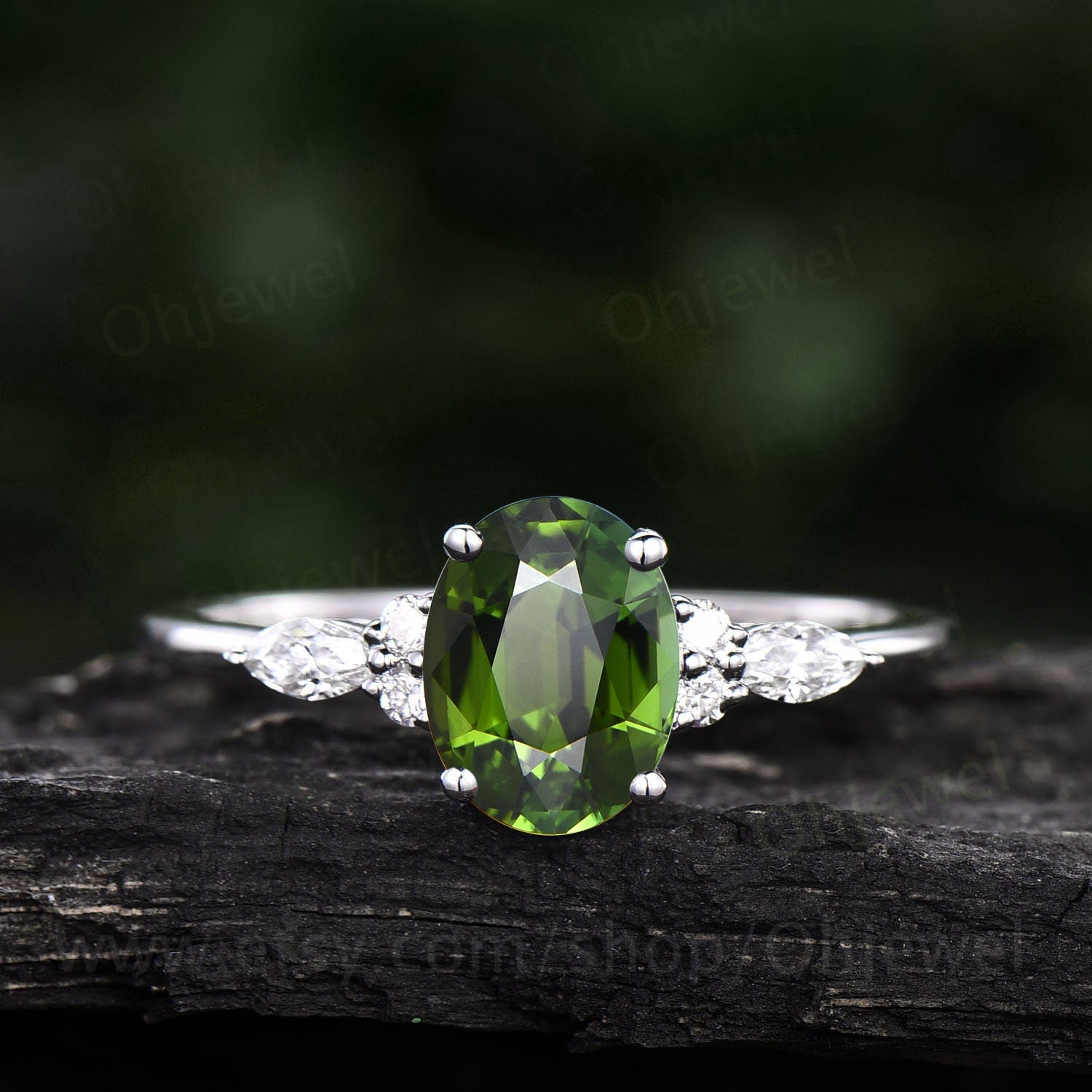 This is a natural green tourmaline engagement ring in solid gold,about 6x8mm oval cut. The accent stones are round 1.5mm and marquise 2x4mm diamonds or moissanites.