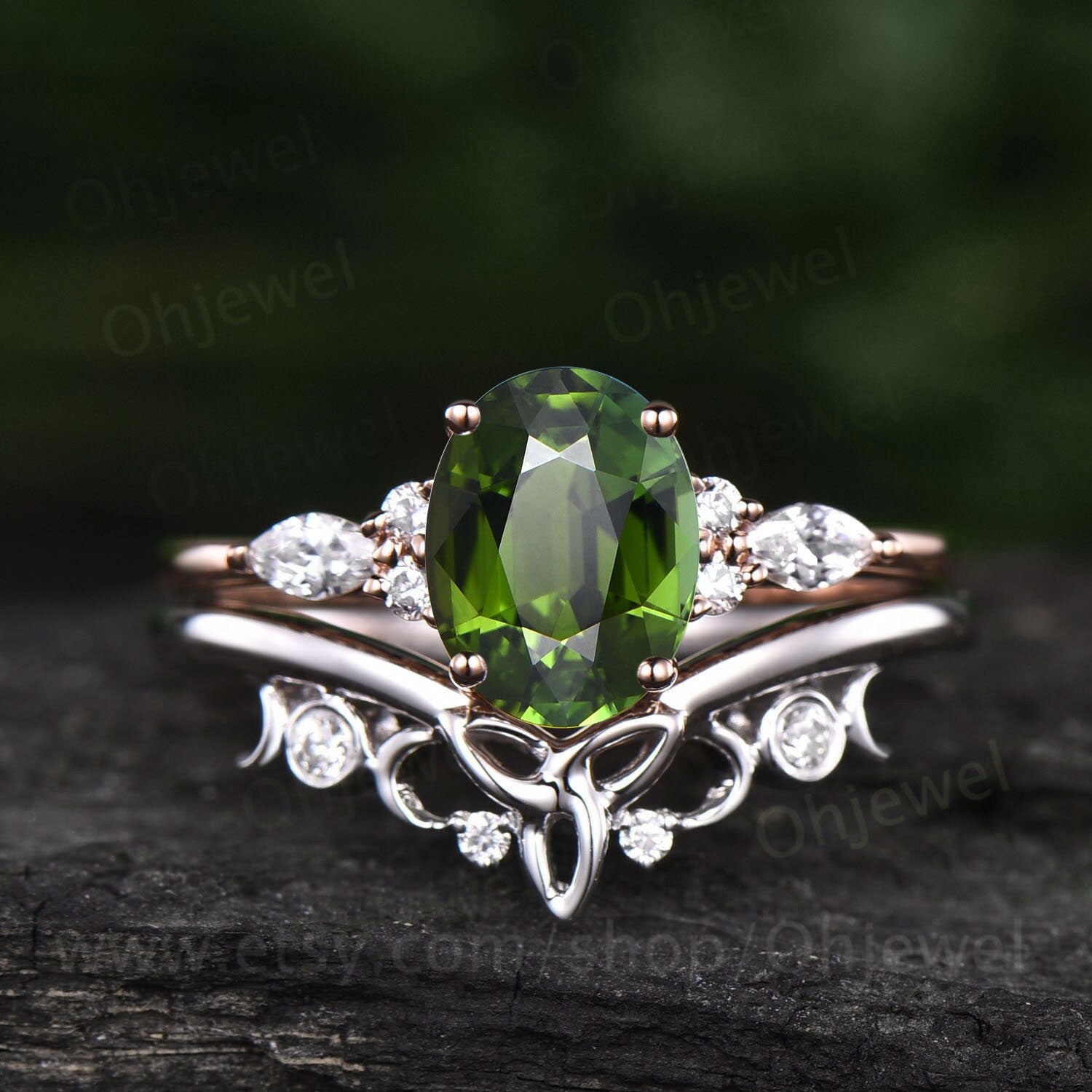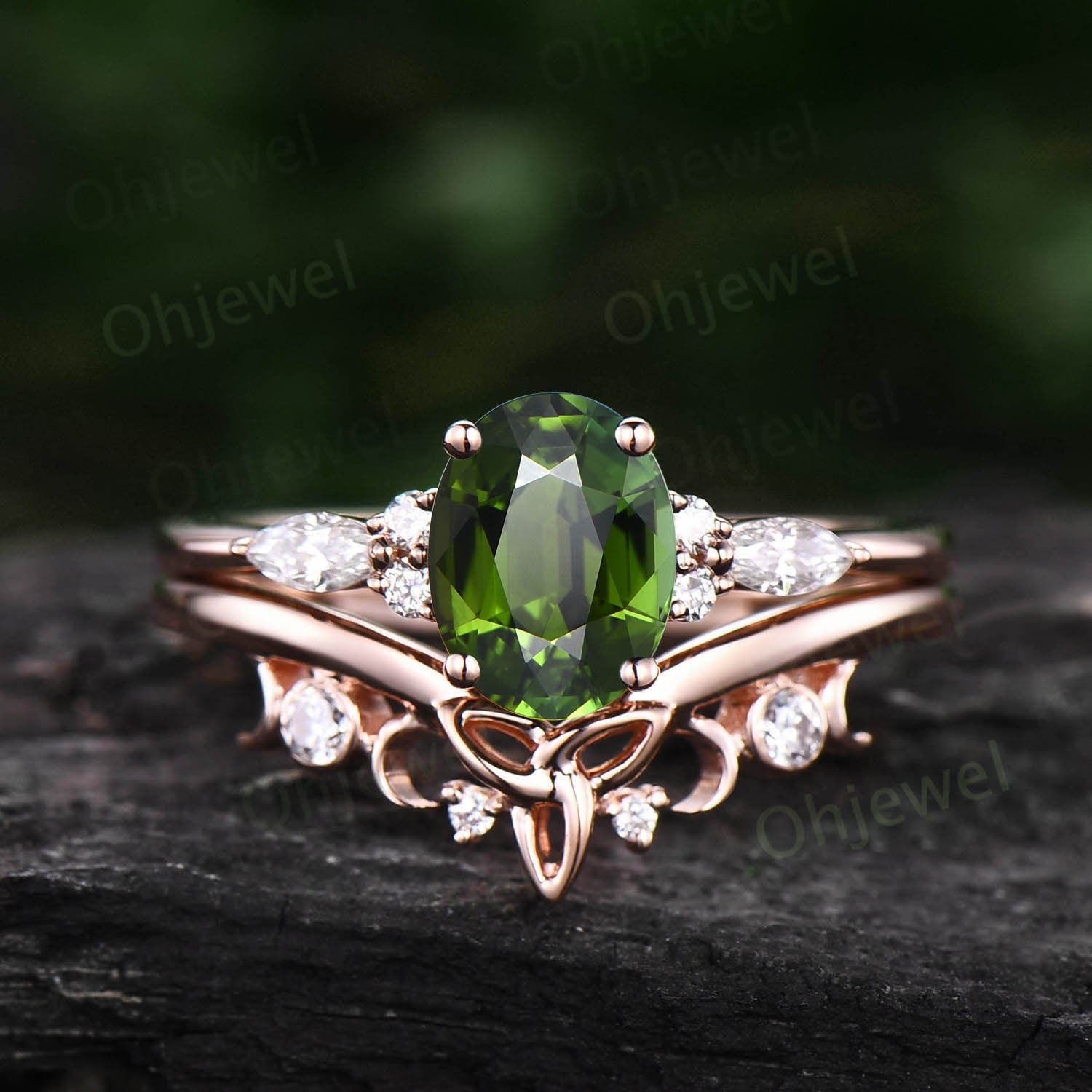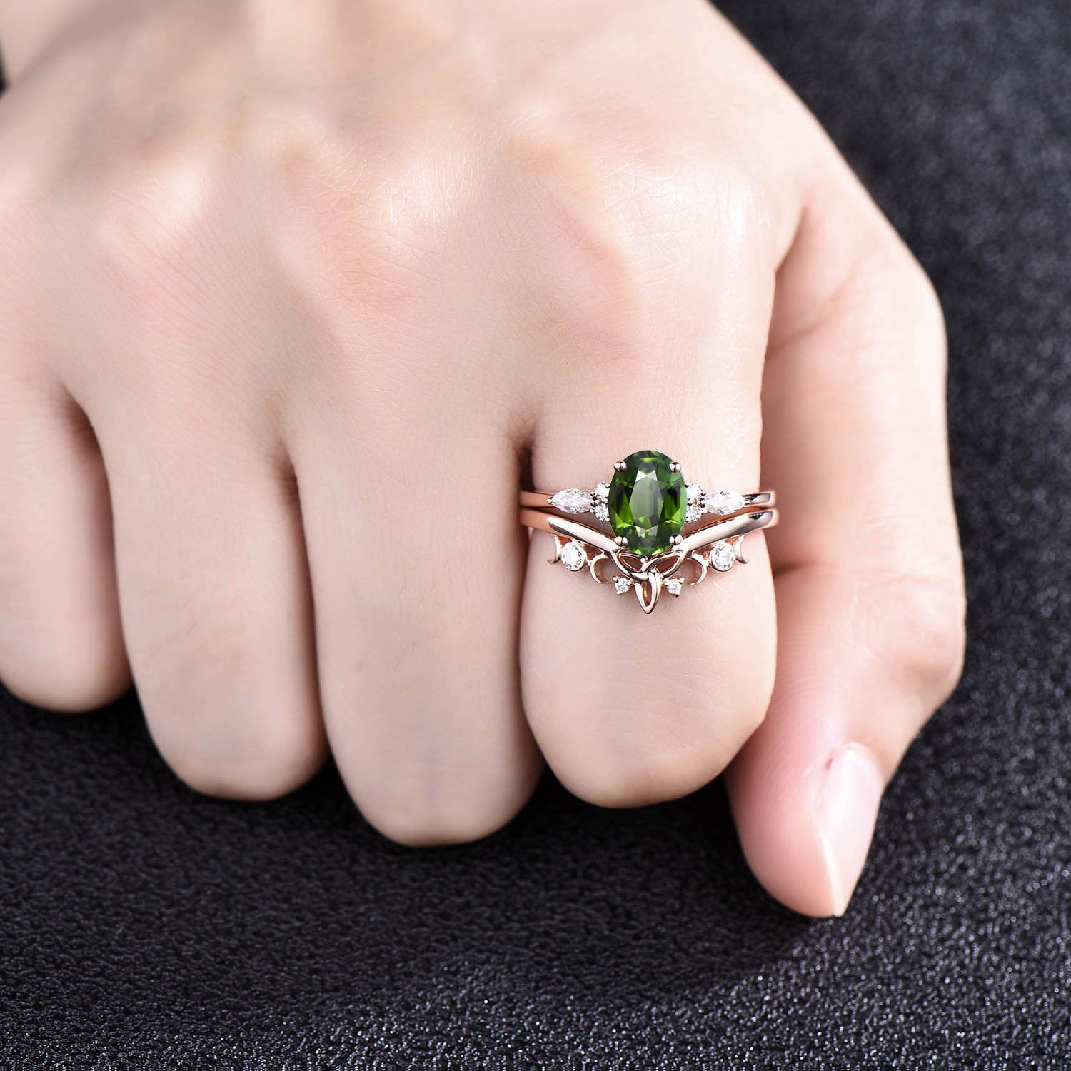 Vintage Oval cut green tourmaline ring unique engagement ring set 14k rose gold diamond ring women Celtic knot Norse Viking ring Jewelry