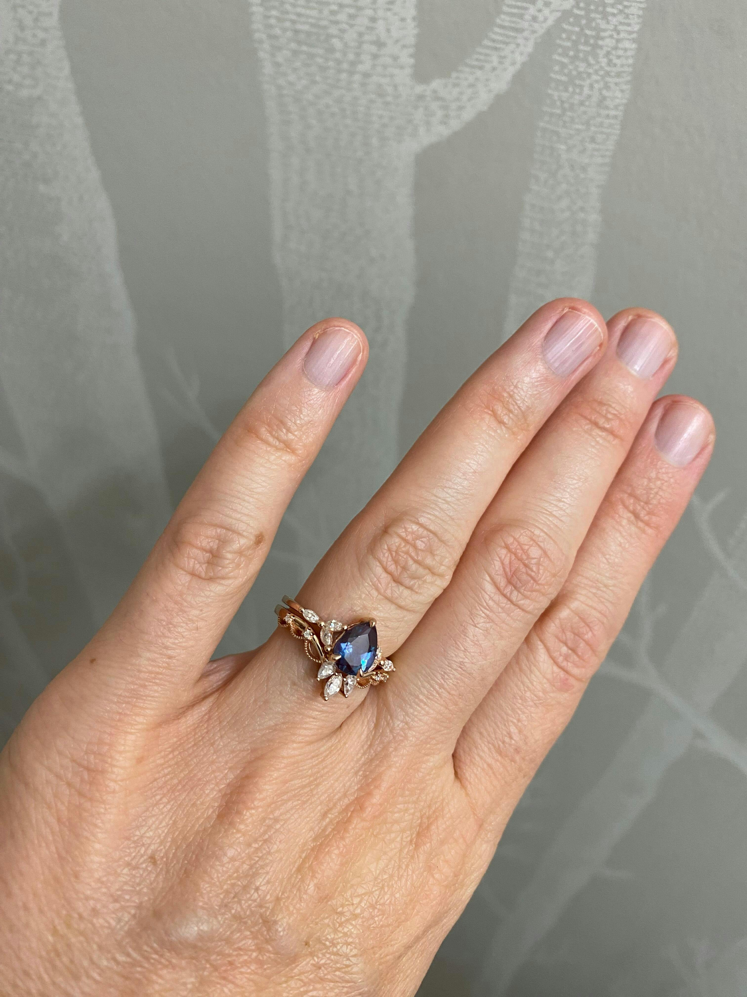 This is a Lab Alexandrite engagement ring in solid gold,about 6x8mm pear cut. The accent stones are marquise 1.5x3mm moissanites.