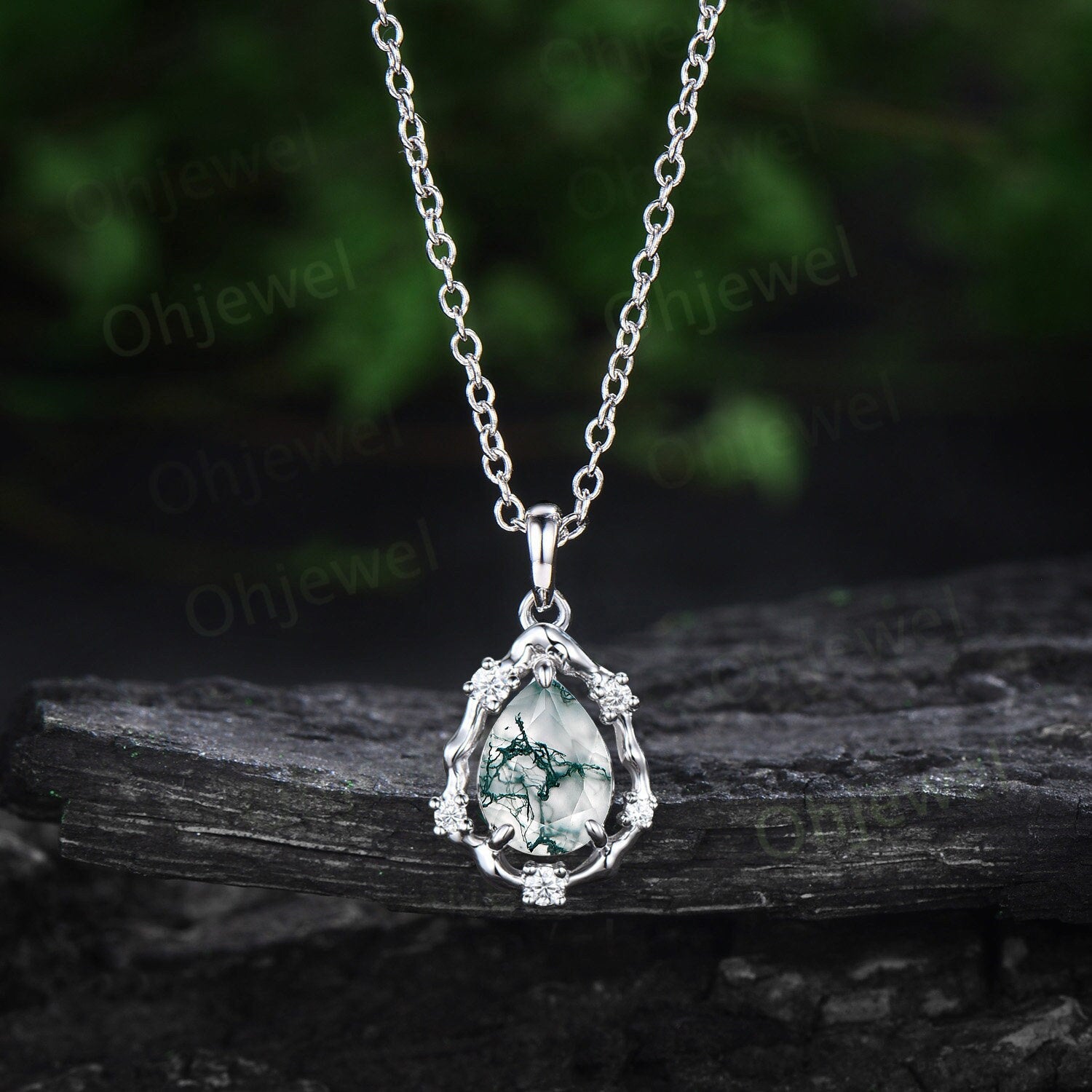 Vintage pear green moss agate necklace 14k white gold halo leaf twig vine branch art deco diamond Pendant women birthday anniversary gift