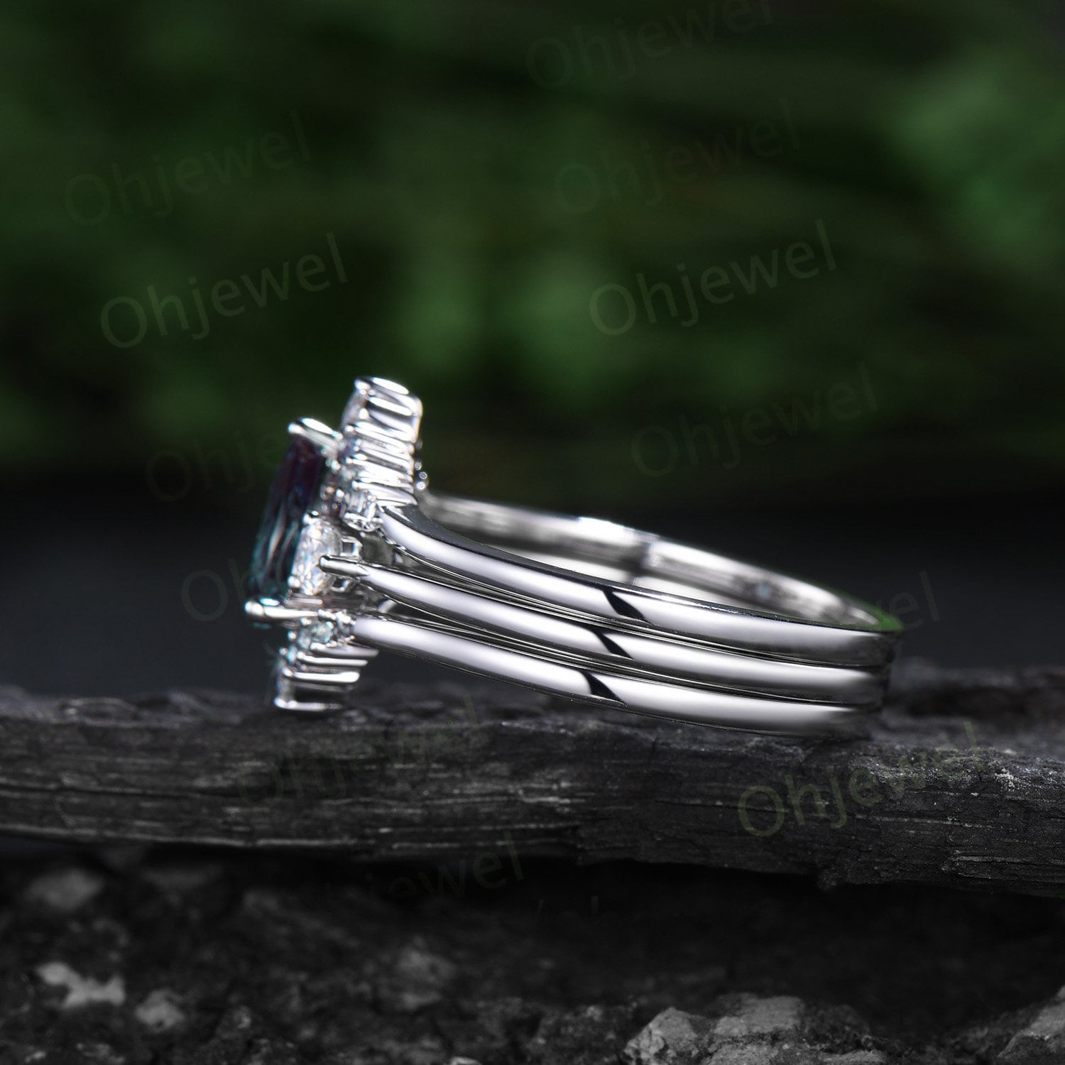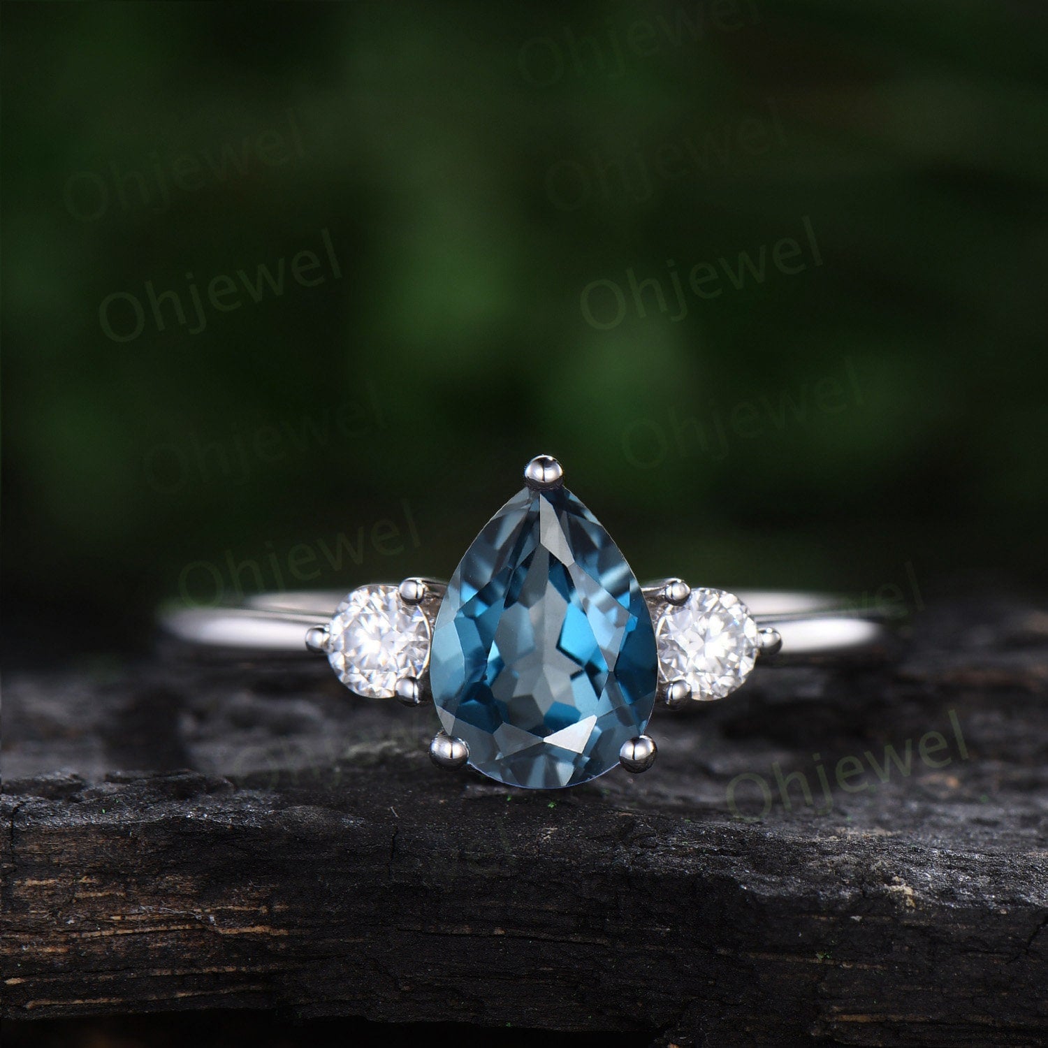 Vintage Pear London blue topaz engagement ring 14k white gold three stone moissanite ring women sapphire bridal promise wedding ring set
