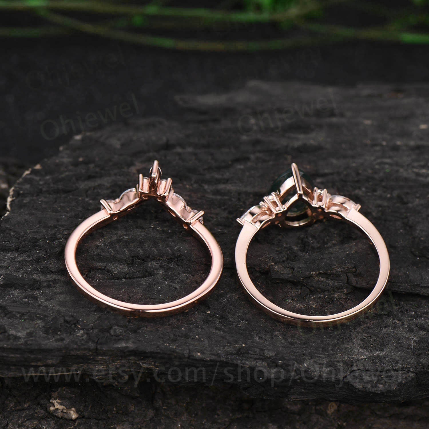 Vintage pear shaped green emerald engagement ring set art deco rose gold marquise cut moissanite ring set unique wedding ring set for women