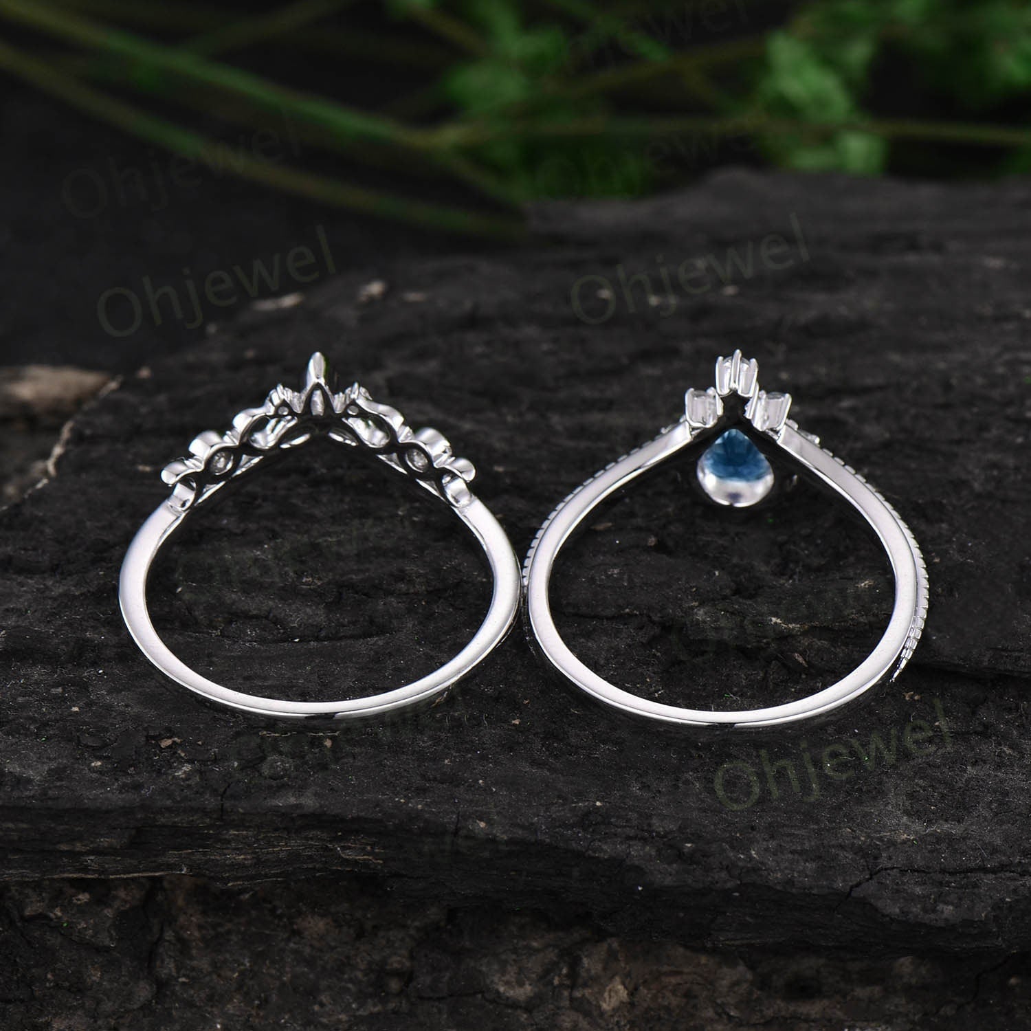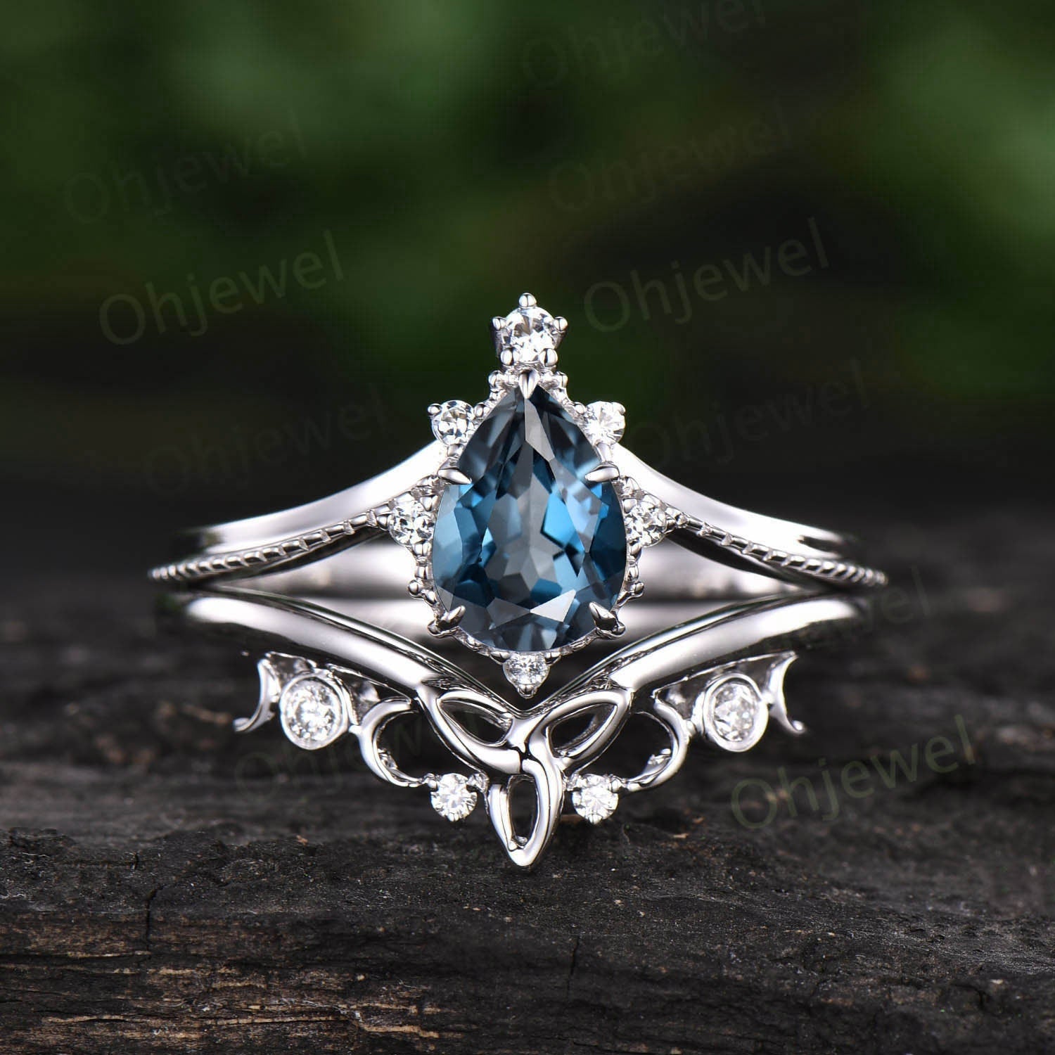 Vintage pear shaped London blue topaz engagement ring set rose gold cluster diamond ring dainty unique bridal wedding ring set women gift