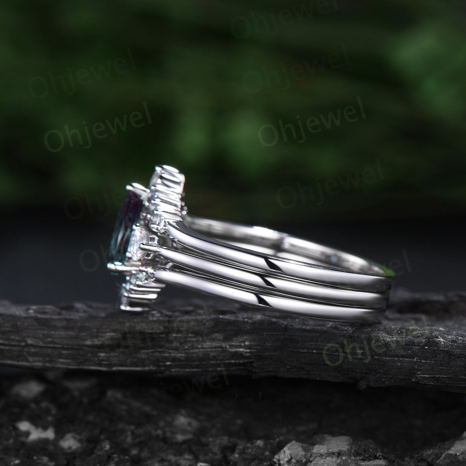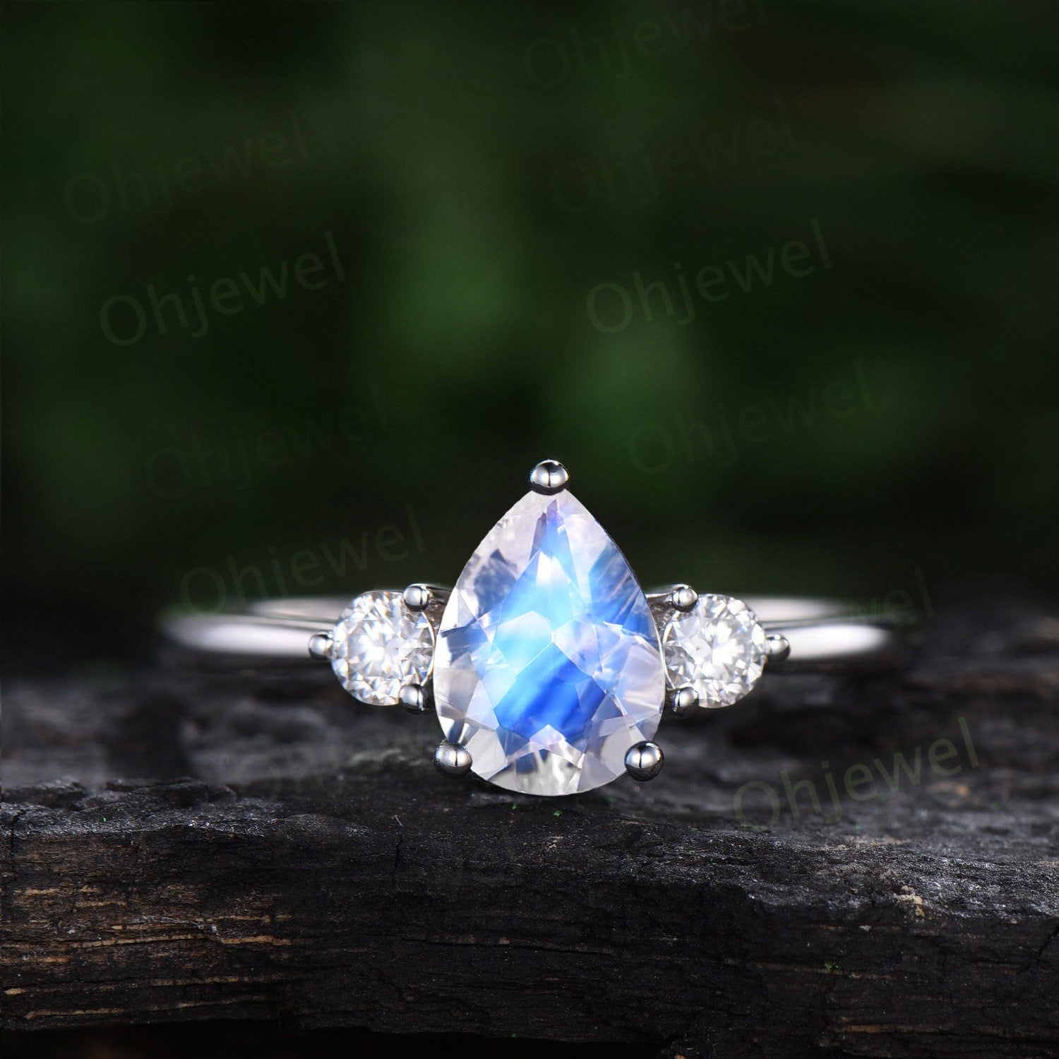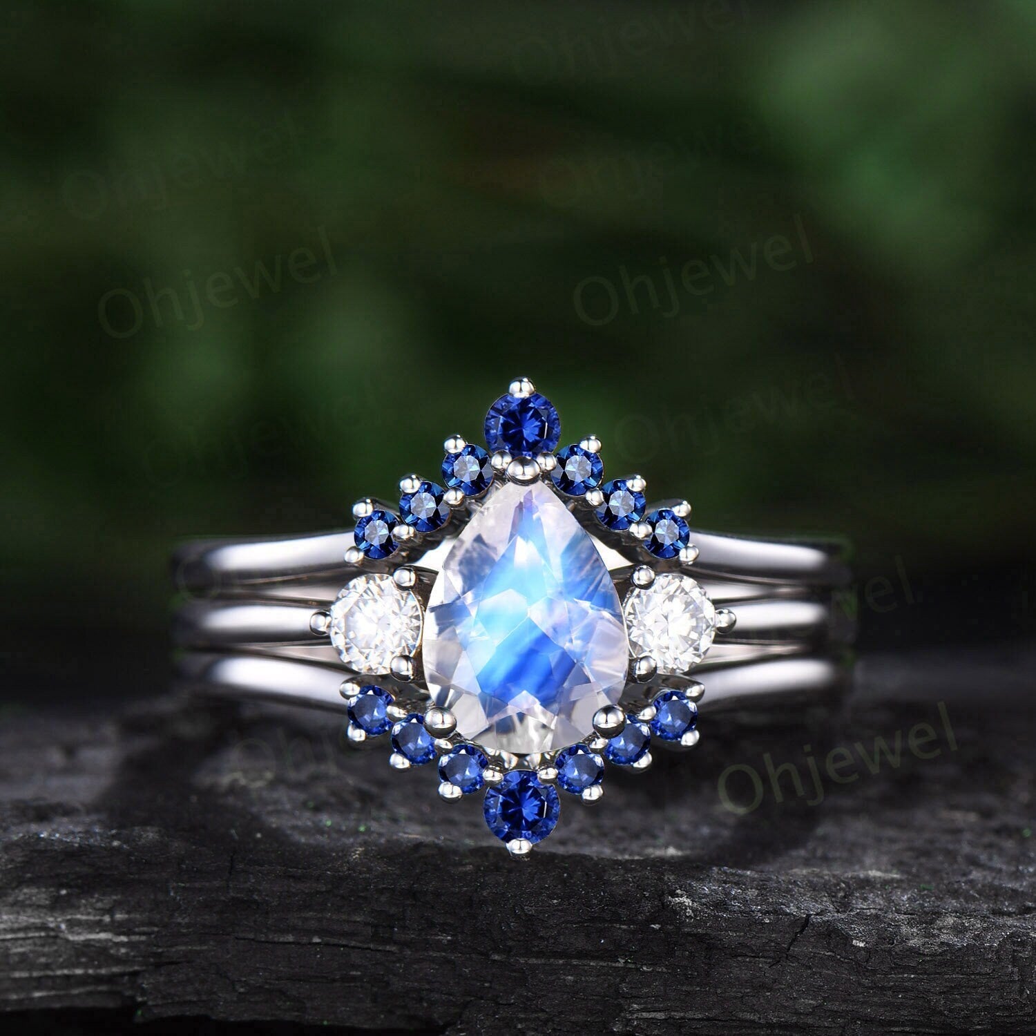 Vintage Pear shaped moonstone engagement ring 14k white gold three stone moissanite ring women sapphire wedding ring set blue gemstone gift