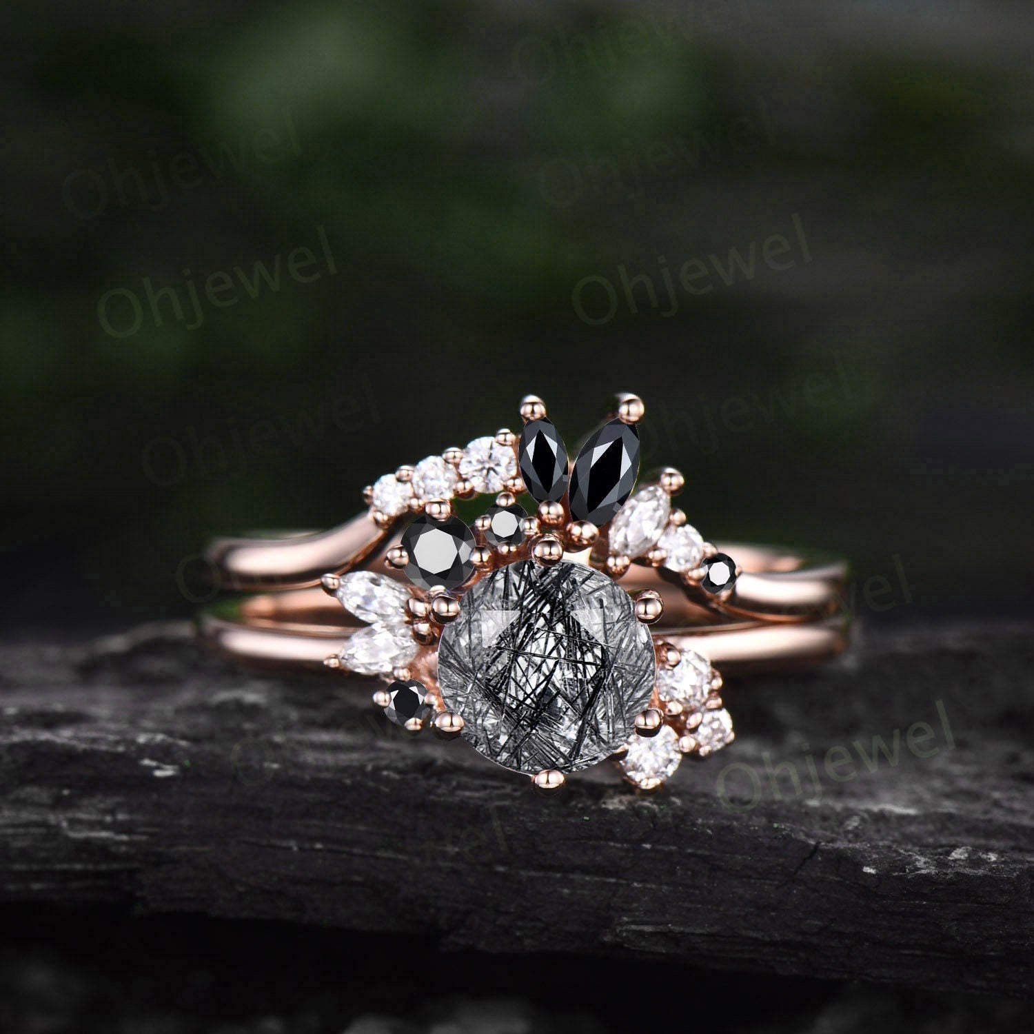 Vintage round cut black rutilated quartz engagement ring set rose gold cluster moissanite ring set black diamond wedding ring set for women