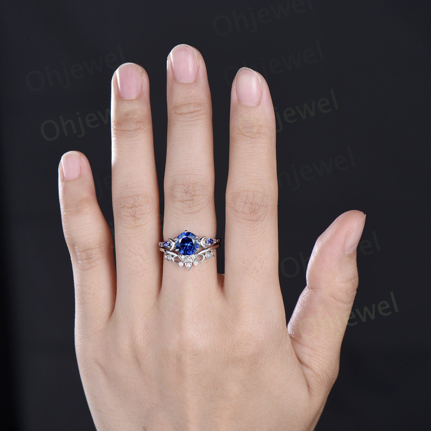 Vintage round cut blue sapphire engagement ring white gold five stone moon celtic knot opal stacking wedding anniversary ring set women