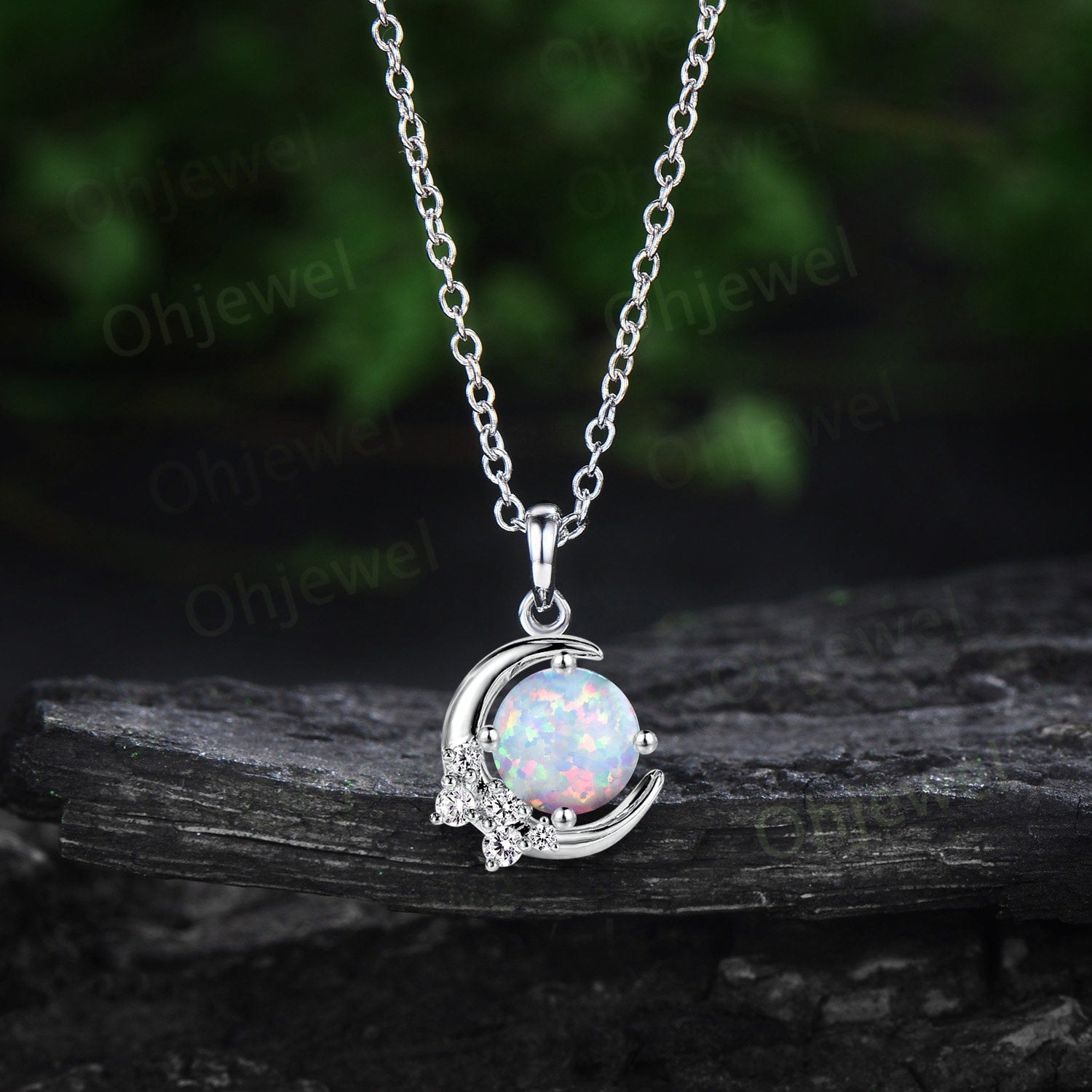 Vintage round white opal necklace 14k rose gold Personalized dainty moon cluster diamond unique Pendant women birthday anniversary gift