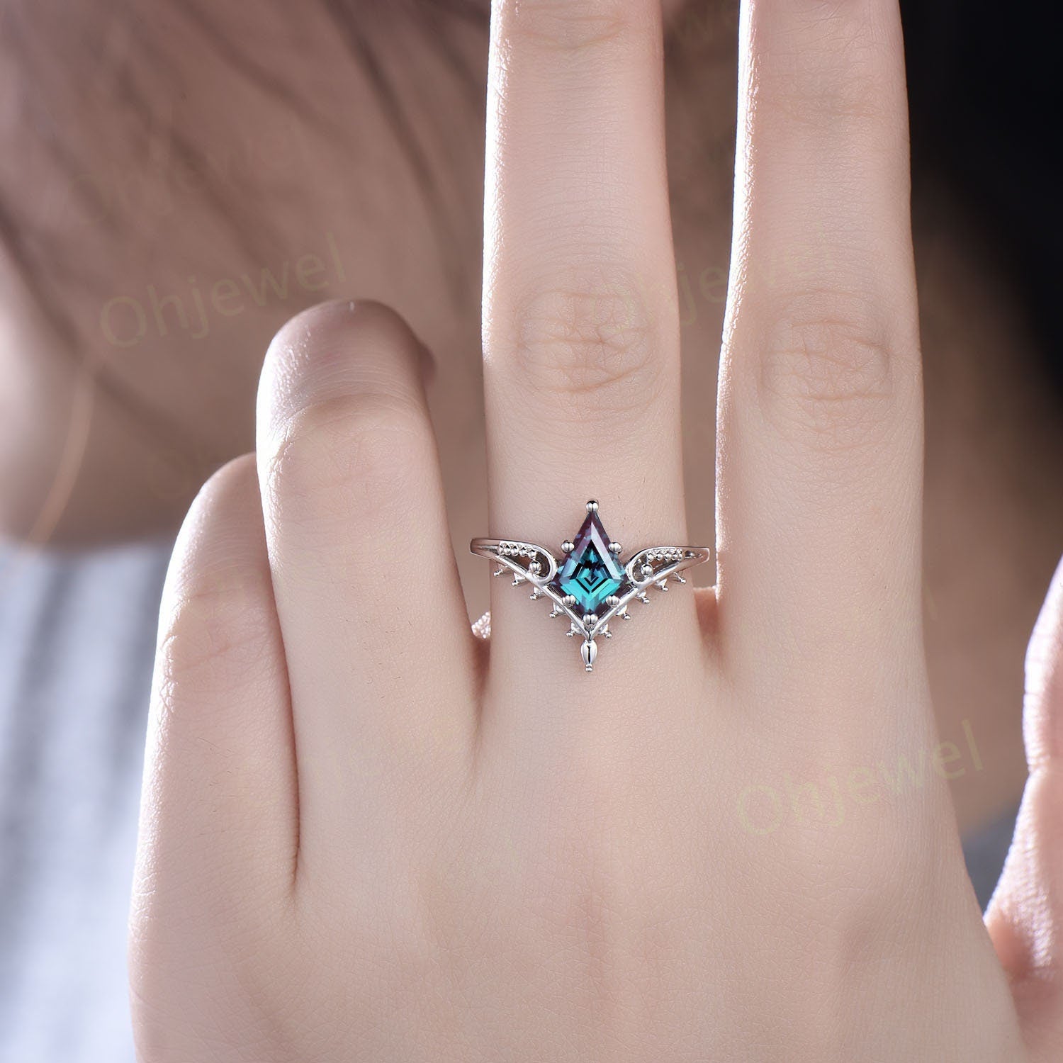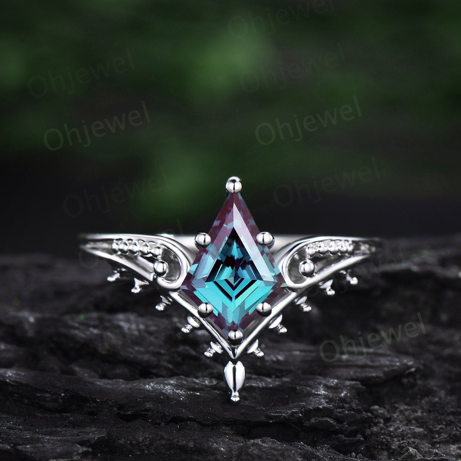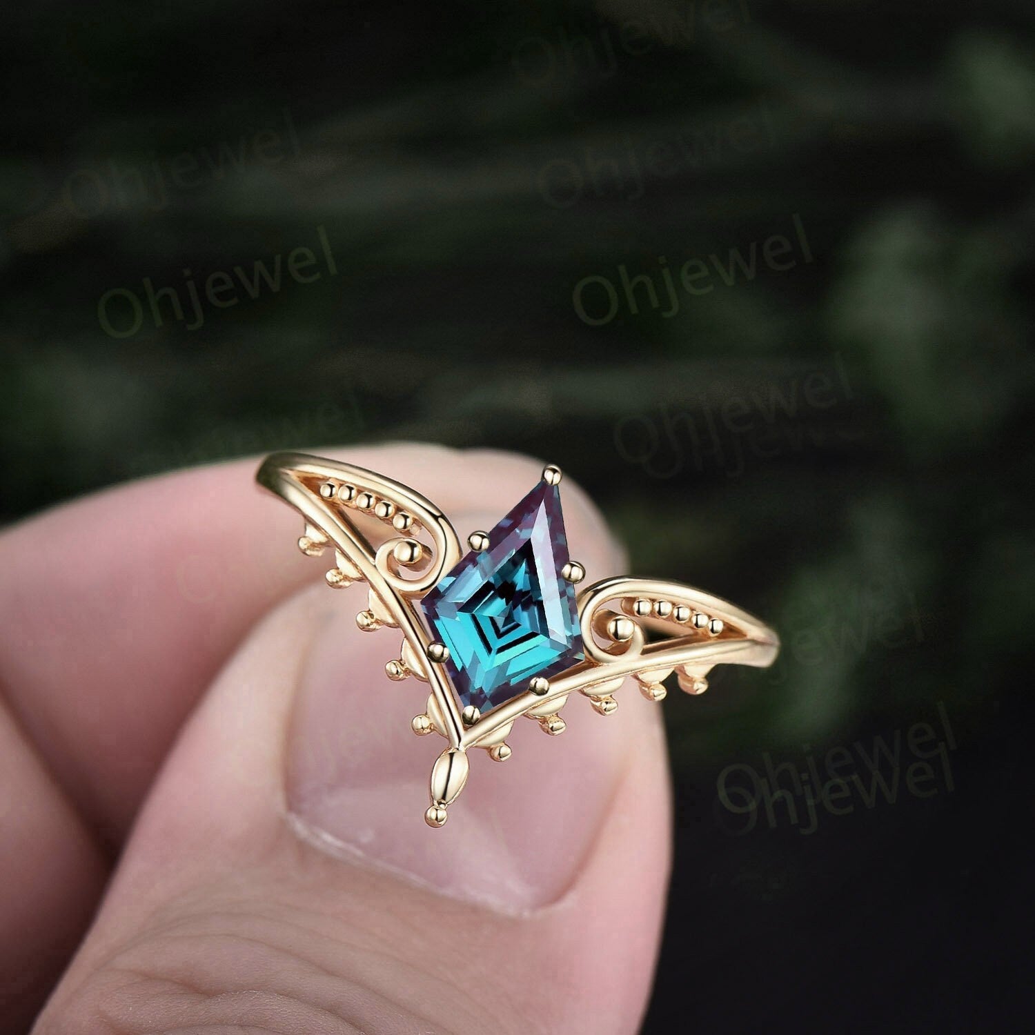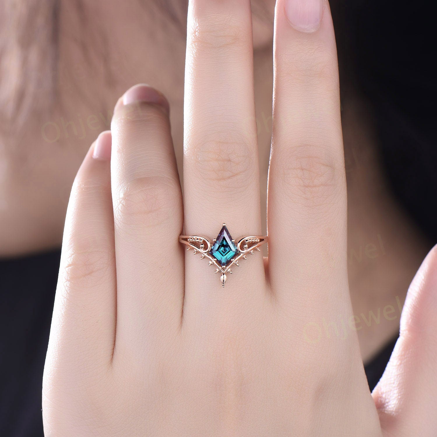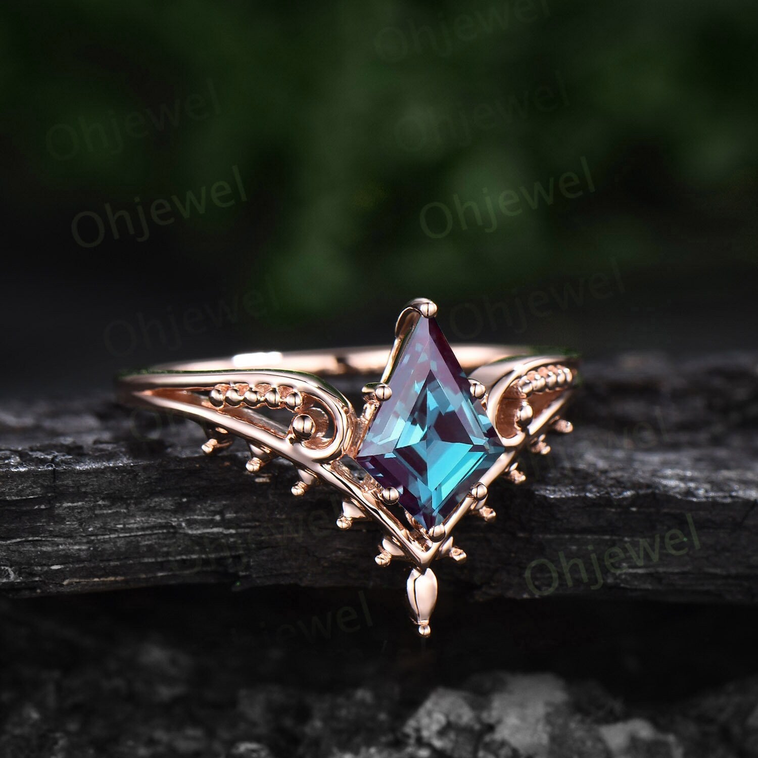 Vintage style kite cut Alexadrite ring unique split shank Solitaire engagement ring 14k rose gold antique promise wedding ring for women