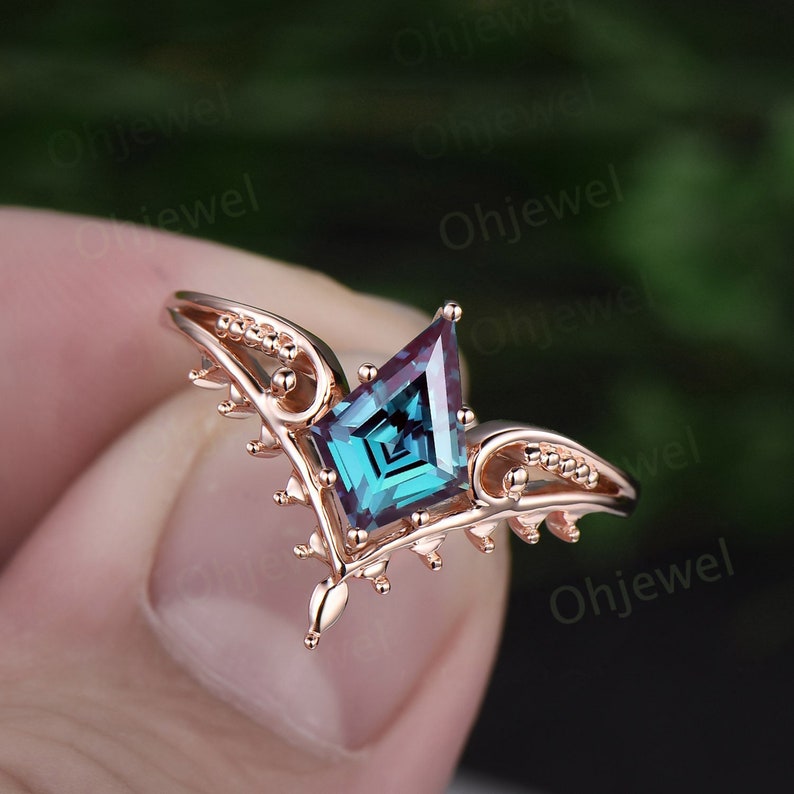 This is a 1 carat lab Alexadrite engagement ring in solid gold,about 6x9mm kite cut.