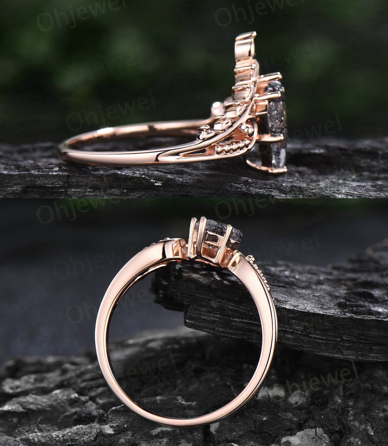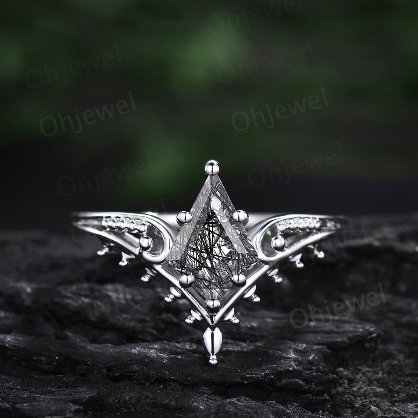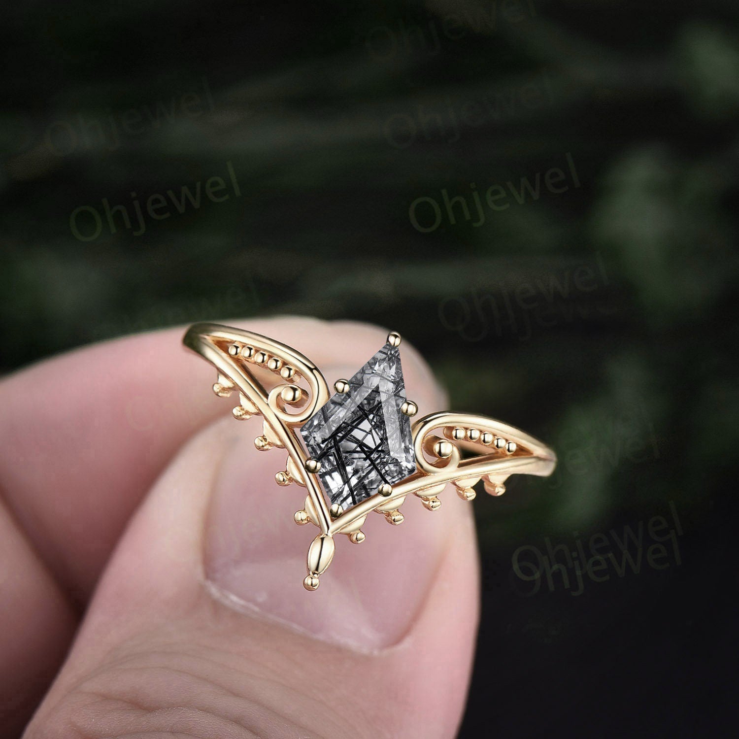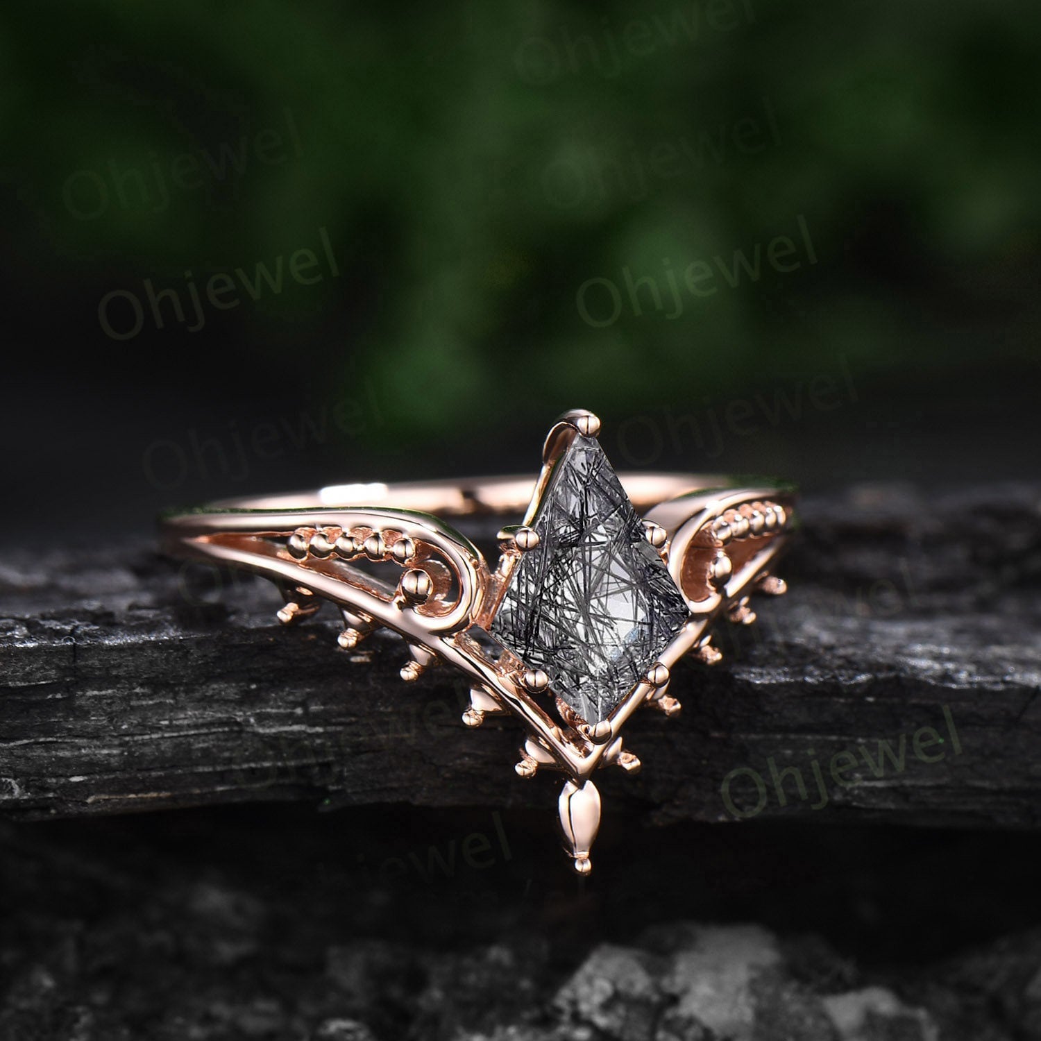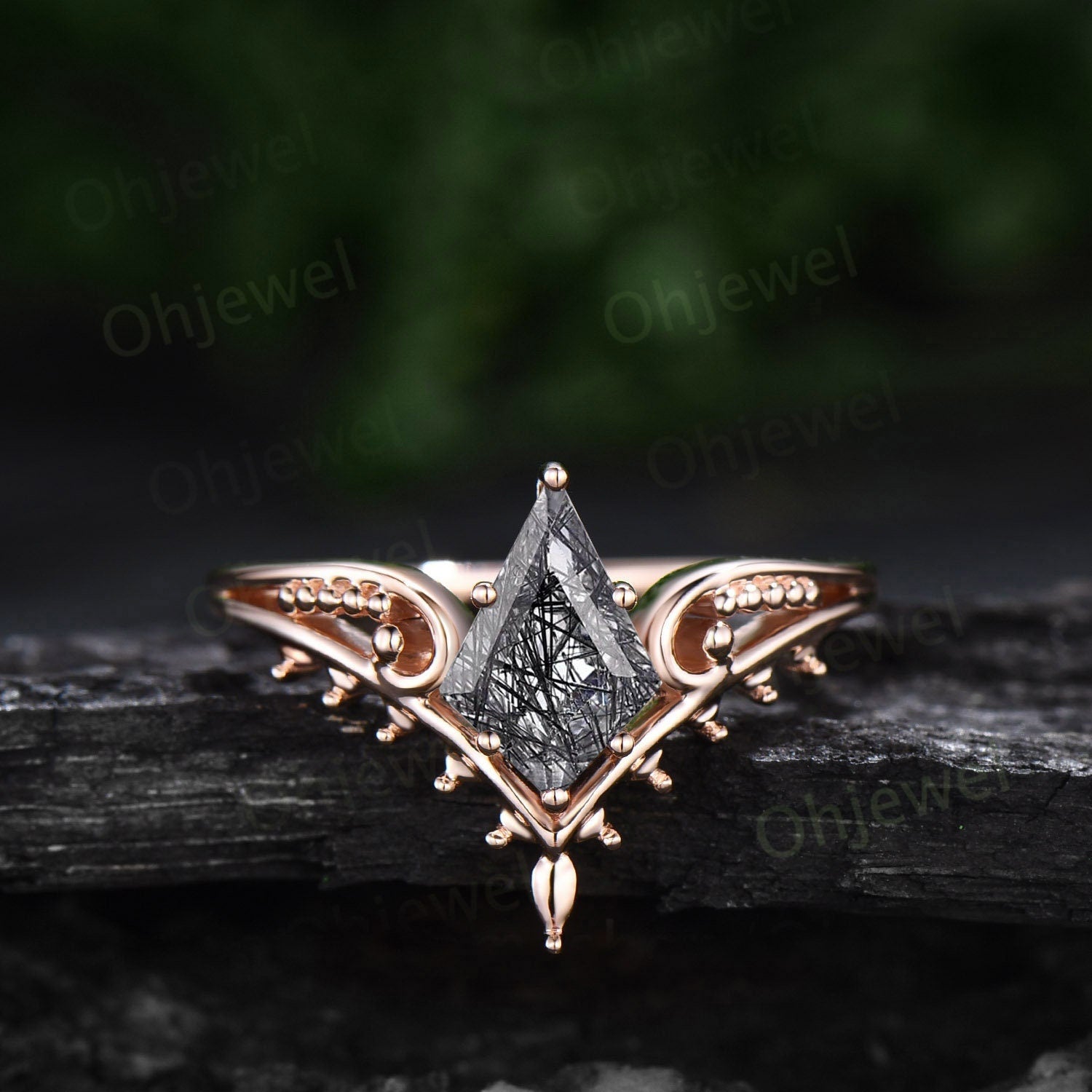 Vintage style kite cut black rutilated quartz ring unique split shank Solitaire engagement ring 14k rose gold women promise wedding ring